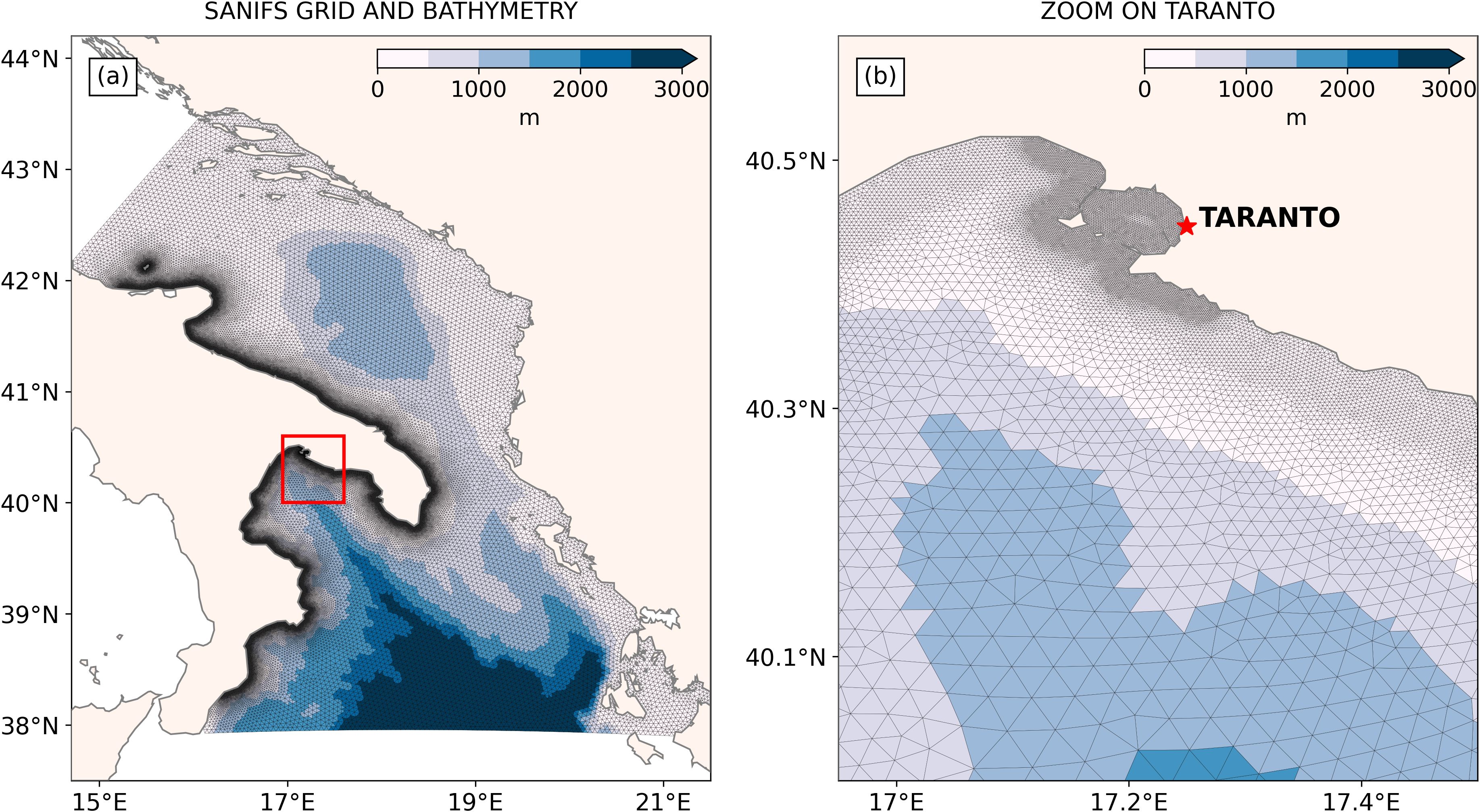 In the experiments, we used the SANIFS application of SHYFEM described by Federico et al. (2017). SANIFS is a coastal-ocean operational system providing 3-day forecasts. The operational chain is based on a downscaling approach starting from the large-scale system, MedFS (Coppini et al., 2023), which provides the open-sea fields. The SANIFS numerical domain, grid, and bathymetry are shown in Figure 1a. In the coastal waters of the eastern Italian coastlines, SANIFS has a high spatial resolution, reaching an element size of 500m, with higher resolution in specific areas (e.g. Mar Grande near Taranto) where it reaches 50m (Figure 1b). In the open sea, the resolution is approximately 3-4km, which provides a smoother nesting to the parent model MedFS (1/24°, approximately 4km). The vertical grid consists of 92 unevenly distributed z-levels with higher resolution closer to the sea surface. This is appropriate for solving the field in coastal and open-sea regions (Federico et al., 2017). Thanks to the high horizontal resolution, the model configuration has been shown to provide reliable hydrodynamics and active tracer forecasts in mesoscale-shelf-coastal waters of Southern Eastern Italy (Apulia, Basilicata, and Calabria regions, Federico et al., 2017). The SANIFS implementation includes both surface and lateral boundary conditions. The air-sea heat flux is parameterised by bulk formulas described in Pettenuzzo et al. (2010), the surface stress is computed with the wind drag coefficient according to Hellerman and Rosenstein 1983, and freshwater flux includes evaporation, precipitation, and climatological river runoff from 20 major rivers in the Adriatic and Ionian basins. River salinity is fixed at 15 psu. ECMWF products provided atmospheric forcing, interpolated to the model grid. At the open boundaries, SANIFS is nested to MedFS outputs, prescribing non-tidal sea surface elevation, temperature, salinity, and 2D velocity fields. Additionally, tidal elevations from OTPS (Oregon State University Tidal Prediction Software; Egbert and Erofeeva, 2002) with eight major constituents (M2, S2, N2, K2, K1, O1, P1, Q1) are imposed at the boundary nodes. The complete numerical model setup is extensively described in Federico et al. (2017), and its spatial features are briefly summarised in Table 1.