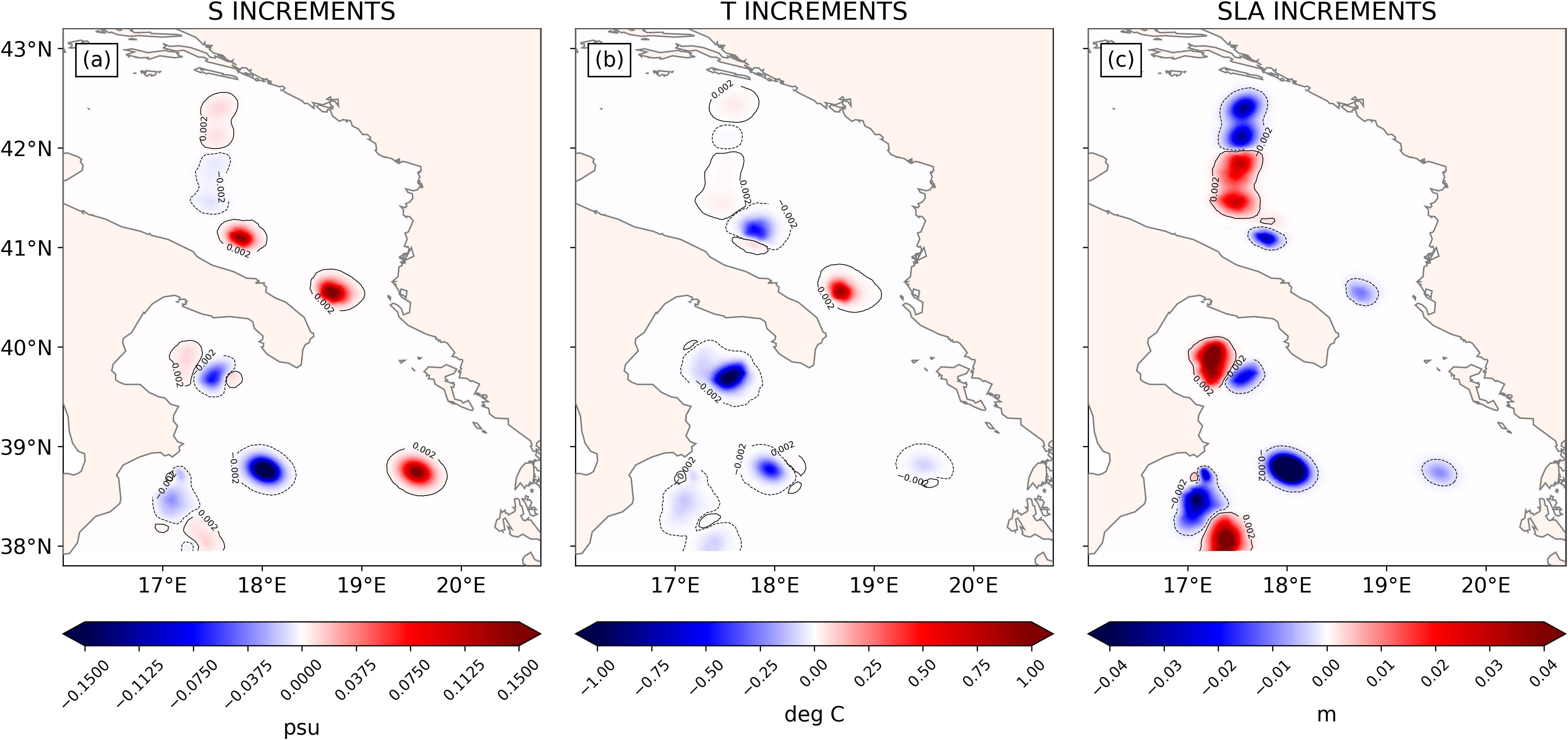 The SANIFS modelling system with DA alternates between running SHYFEM and OceanVar in steps of 24 hours. These form the assimilation windows in which the output of the SHYFEM model is compared to the available observations within the window. OceanVar calculates the minimum of the cost function using the model background read from the output fields and calculates the analysis increments. The increments are applied to the SHYFEM restart files at the start of the next 24-hour cycle. Figure 5 shows an example of a typical set of analysis increments on the unstructured grid, with the horizontal spread (R = 8km) modelled using the novel utRF algorithm. Similarly to the test performed on a synthetic dataset in Figure 3, the utRF implemented in OceanVar shows a good approximation of the Gaussian horizontal covariance. Moreover, the figure shows how the triradiate dynamic height operator produces increments in S and T fields from SLA observations (Figures 5a, b) and vice versa S and T observations produce increments in the SLA field (Figure 5c). The presence of SLA observations can be inferred from the spatial arrangement of the corresponding increments, which appear as regularly spaced and aligned features, reflecting the along-track structure of altimetric satellite measurements.