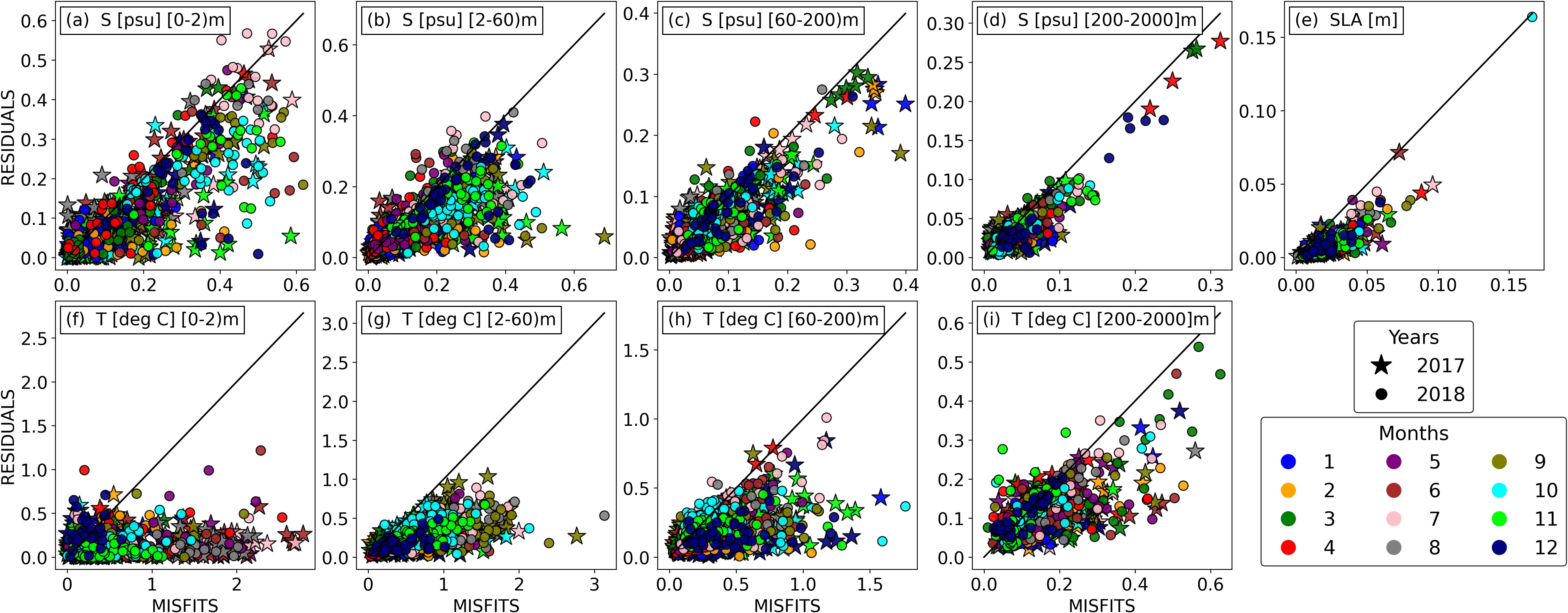 Figure 6. S, T and SLA mean absolute value of misfits and residuals. In (a–d) and (f–i) we show different water column layers for S and T. (e) refers to SLA. Different colours refer to different months. Stars for 2017 and circles for 2018.