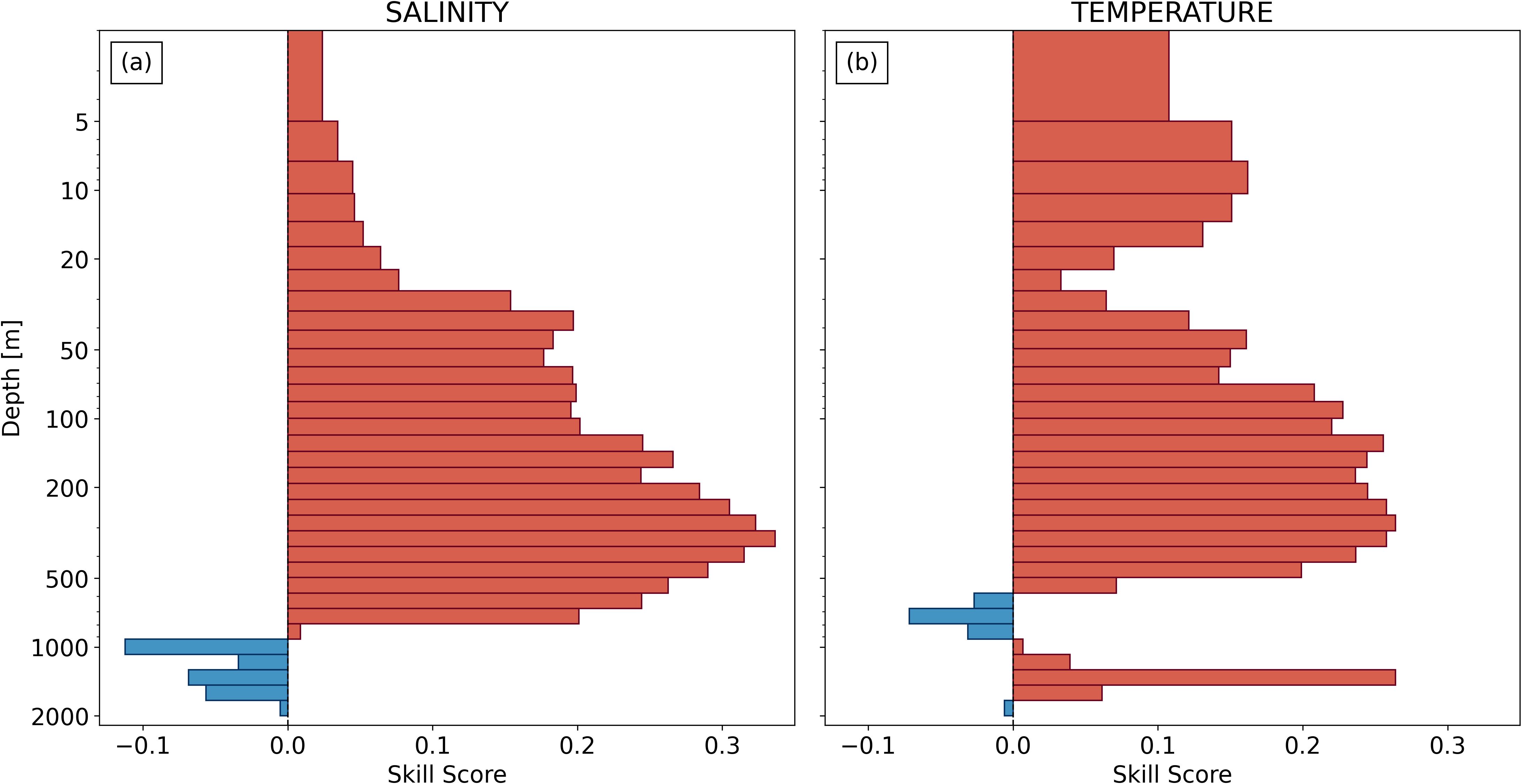 Figure 7. Skill scores of the data assimilation experiment compared to the control experiment without data assimilation for (a) salinity and (b) temperature as a function of depth. Positive (red) values indicate an improved model skill with data assimilation.