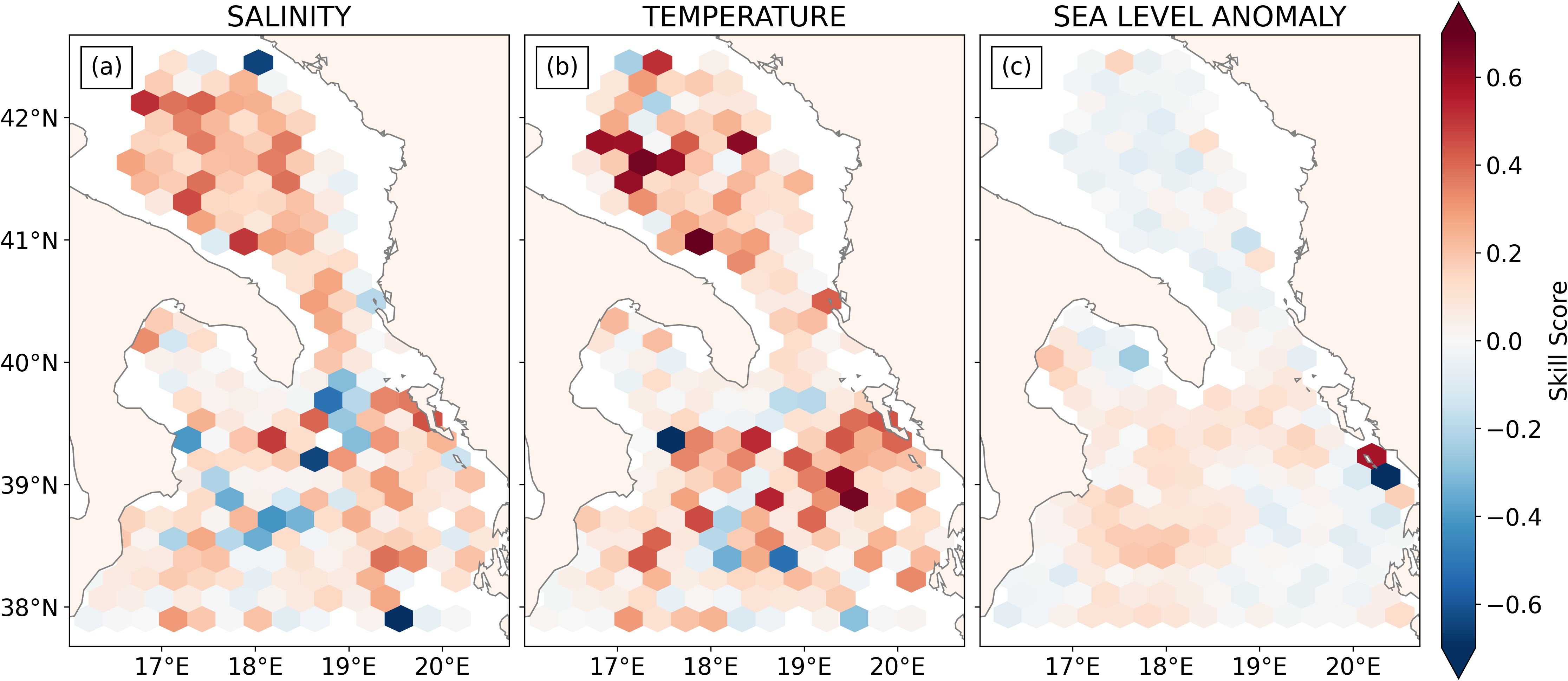 Figure 8. Skill scores of the data assimilation experiment compared to the control experiment without data assimilation for (a) salinity, (b) temperature, and (c) SLA projected on the model domain. Positive (red) values indicate an improved model skill with data assimilation.