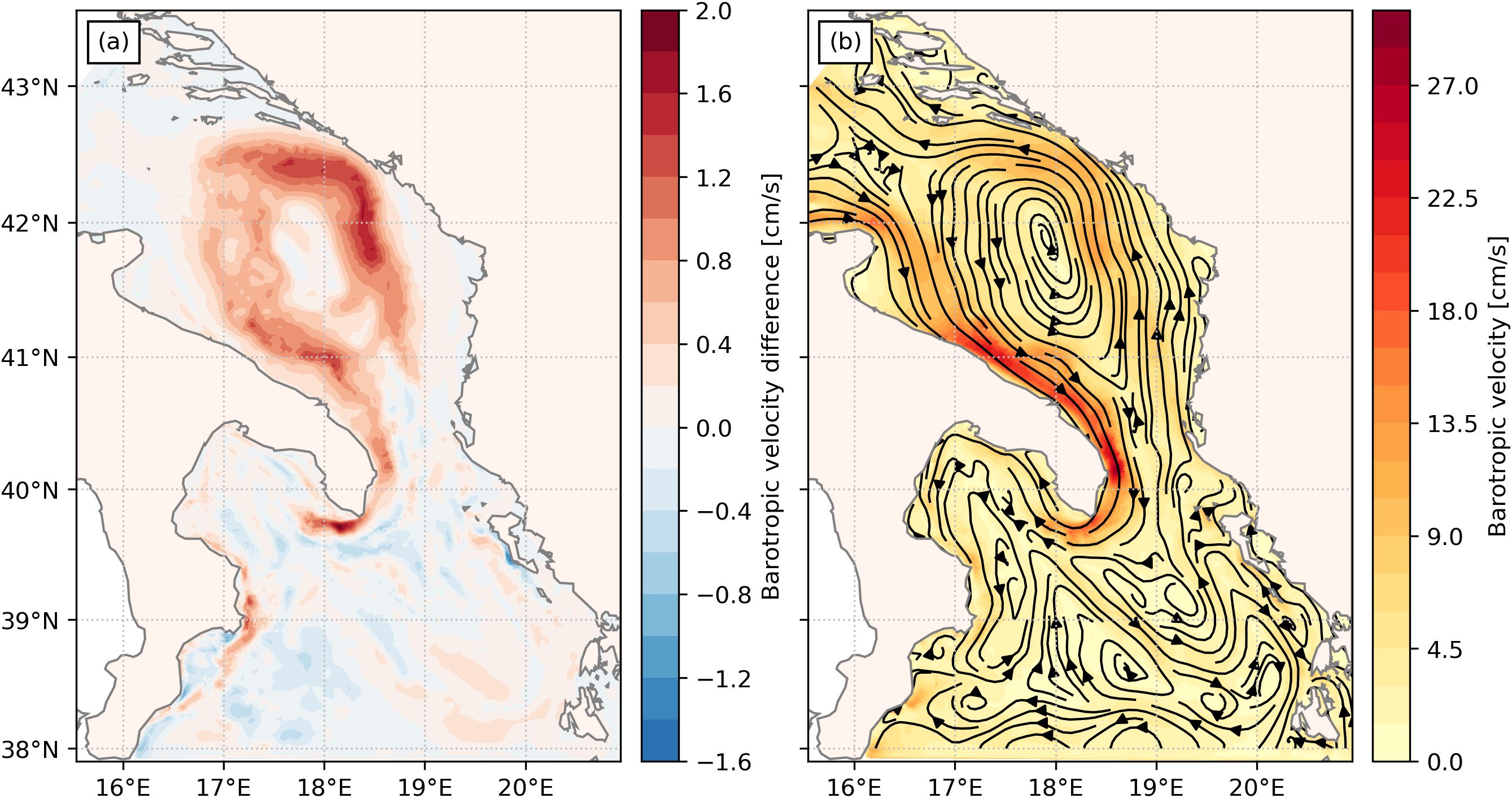 Figure 9. The effect of the assimilation on the mean barotropic velocity in the year 2018. Showing (a) the difference in magnitude between the assimilation and the control run, and (b) the velocity field and its absolute magnitude.