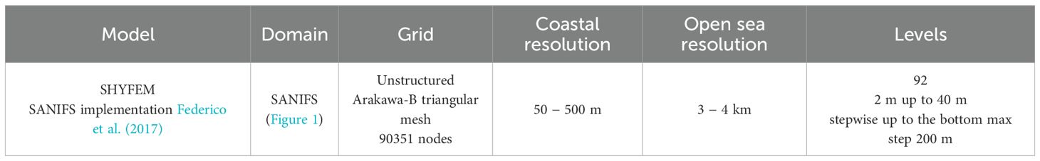 This study uses the parallel implementation of SHYFEM, described in Micaletto et al. (2021). SHYFEM is a 3D finite element unstructured mesh hydrodynamic model solving the Navier-Stokes equations by applying the hydrostatic and Boussinesq approximations. The unstructured grid is Arakawa-B with triangular meshes (Bellafiore and Umgiesser, 2010 and Ferrarin et al., 2013), which provides an accurate description of irregular coastal boundaries. SHYFEM solves the ocean primitive equations, assuming incompressibility in the continuity equation and advection-diffusion equation for active tracers using finite-element discretisation based on triangular elements (Umgiesser et al., 2004). A semi-implicit algorithm is used for the time integration of the free surface equation, the Coriolis term, the pressure gradient in the momentum equation, and the divergence terms in the continuity equation. Vertical eddy viscosity and vertical eddy diffusivity in the tracer equations are treated fully implicitly for stability reasons. Finally, the advective and horizontal diffusive terms in the momentum and tracer equations are treated explicitly (Micaletto et al., 2021). A turbulence closure scheme adapted from the k-ϵ module GOTM (General Ocean Turbulence Model, Burchard and Petersen, 1999) is used to compute the vertical viscosities.