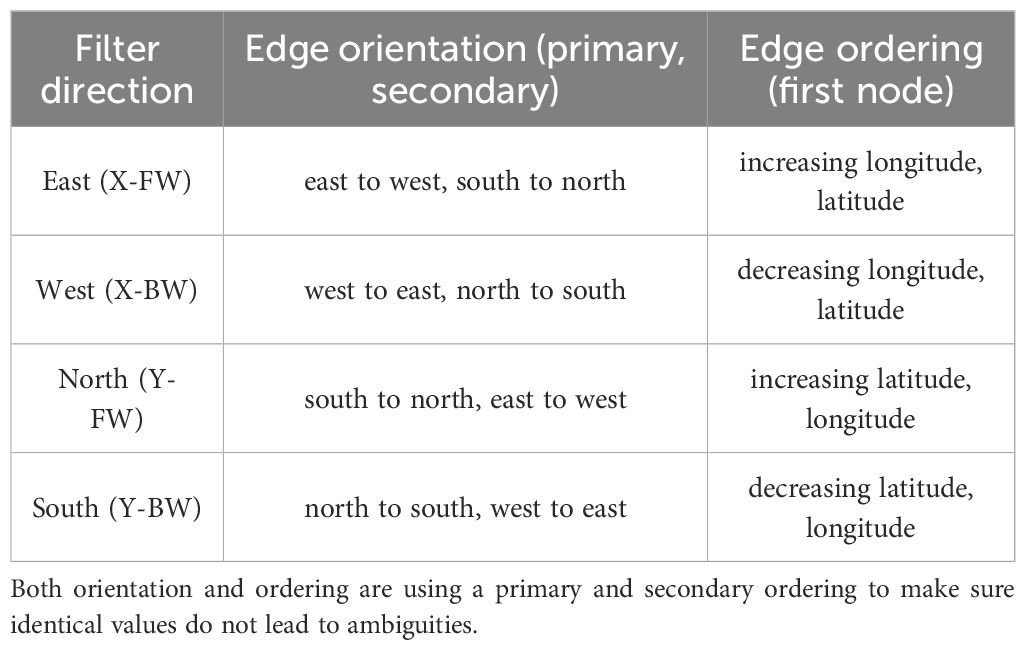 First the edges are oriented in the direction of the filter pass, then the edges are sorted by the coordinates of the first node (i.e. the node providing the contribution). If a pass of the filter is imagined as a line of constant longitude or latitude sweeping through the unstructured mesh, these conditions ensure that information is always propagated from nodes at the filter position in the direction that the filter is moving. In this way, the algorithm satisfies the requirements outlined above. The x and y forward and backward passes can be generalised as four passes in the four cardinal directions, orienting and ordering the edges as summarised in Table 2 and in the pseudo-code in the appendix (Algorithm 1).