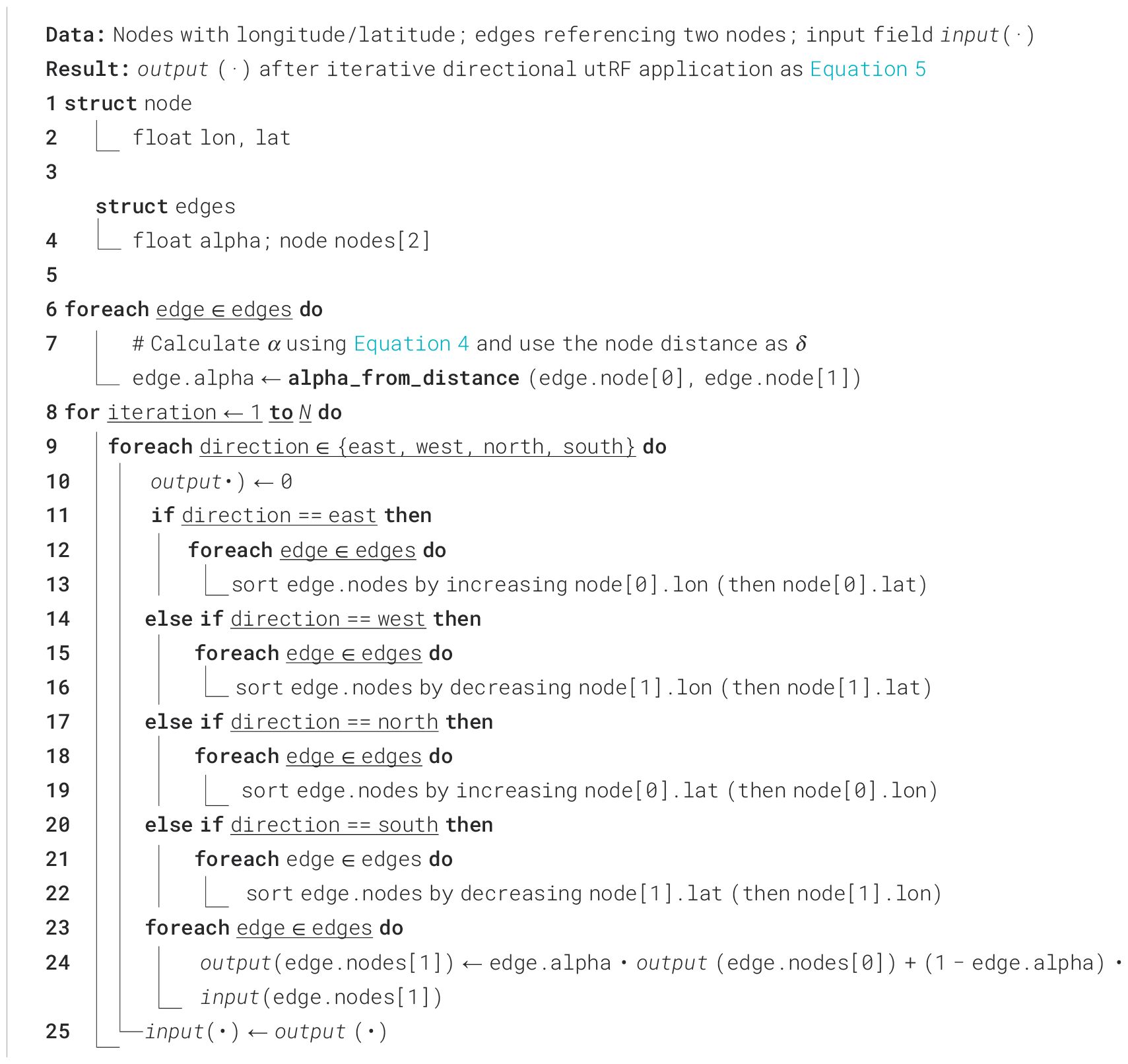 Algorithm 1 implements the directional iterative recursive filter algorithm for triangular unstructured grids, referred to as utRF in the text and discussed in section 2.3.