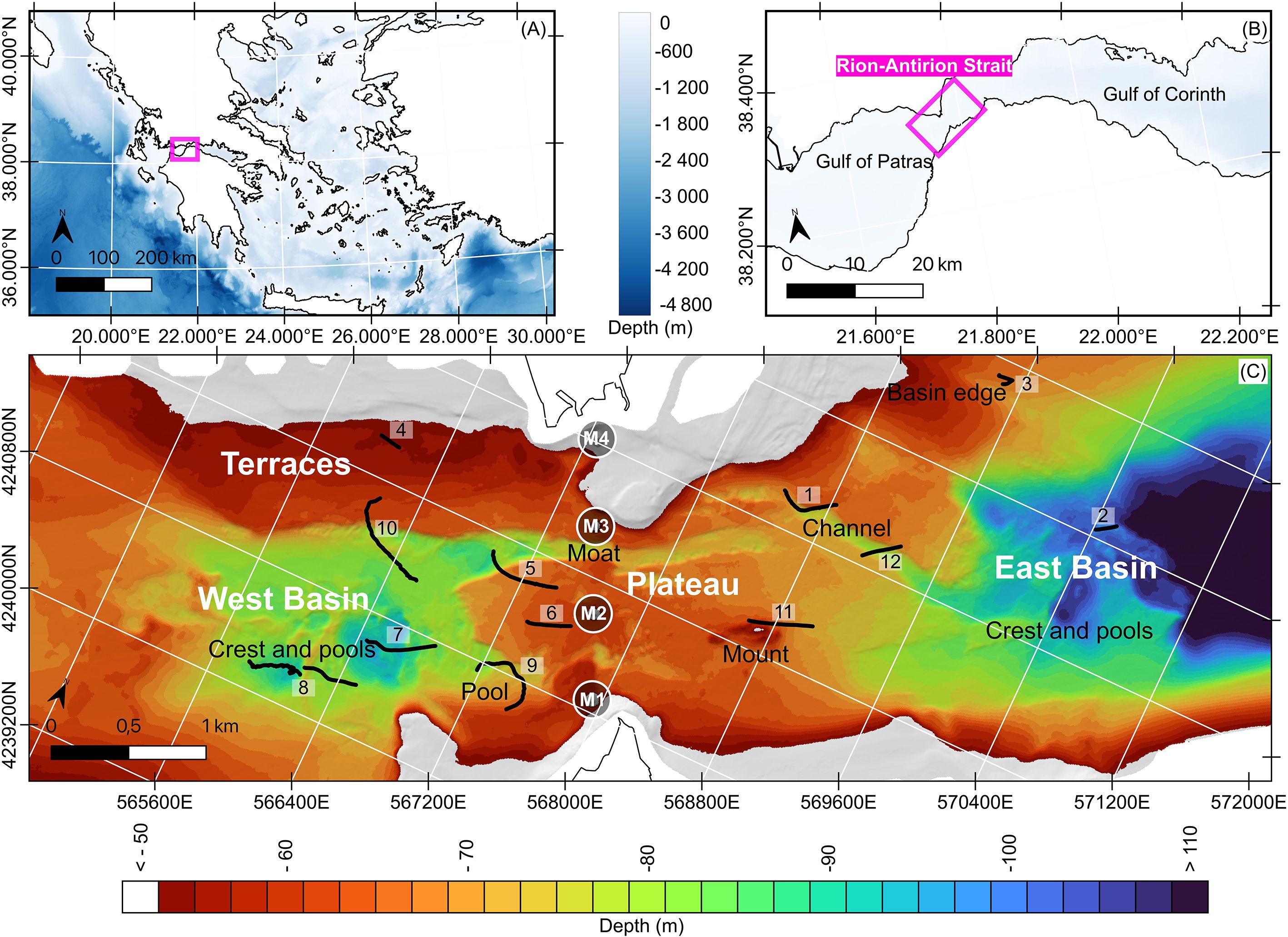 Figure 1. Locations at different scales of the study area using GEBCO 2023 gridded bathymetry data (GEBCO Compilation Group, 2023). (A) Map of Greece. (B) The Rion-Antirion Strait between the Gulfs of Patras and Corinth. (C) Sea-bed morphology below 50 m depth. Named areas: megahabitats (Terraces, Plateau, West Basin, East Basin) and macrohabitats (Crest and pools in West and East Basins; Pool, Moat, Channel, Mount in the Plateau megahabitat). Black lines: 12 video transects conducted in May 2019 and 2023. Circles: footprints of the four piers of the Rion-Antirion Bridge (adapted from Biesiadecki et al., 2004).