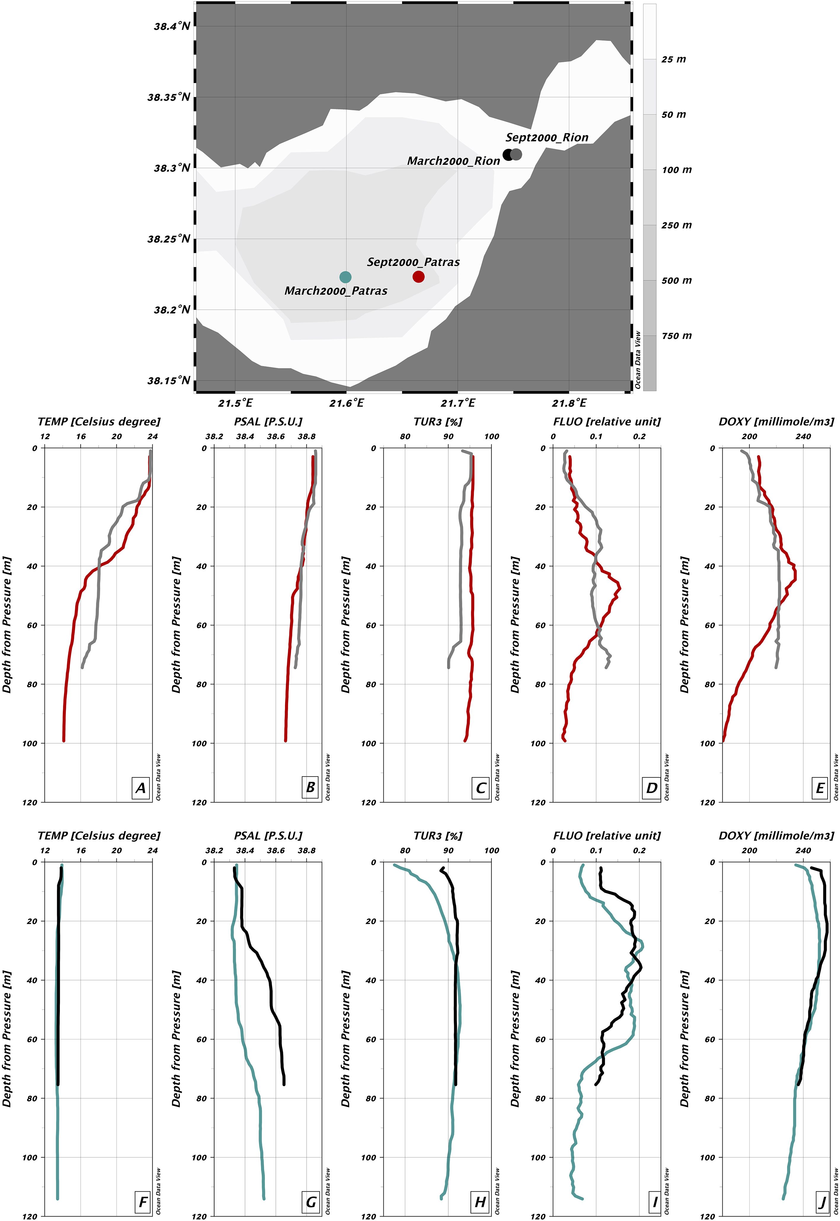 Figure 2. Water column parameters measured using CTD profiles: temperature (°C), practical salinity (psu), turbidity (%), fluorescence (relative units), and dissolved oxygen (mmol/m³). The map shows the measurement locations. Colored dots correspond to selected CTD stations. (A–E) September 2000: 26 Sept. 2000, 12:30, Patras (red); 26 Sept. 2000, 14:25, Rion (grey). (F–J) March 2000: 26 March 2000, 12:30, Patras (green); 26 March 2000, 17:05, Rion (black).