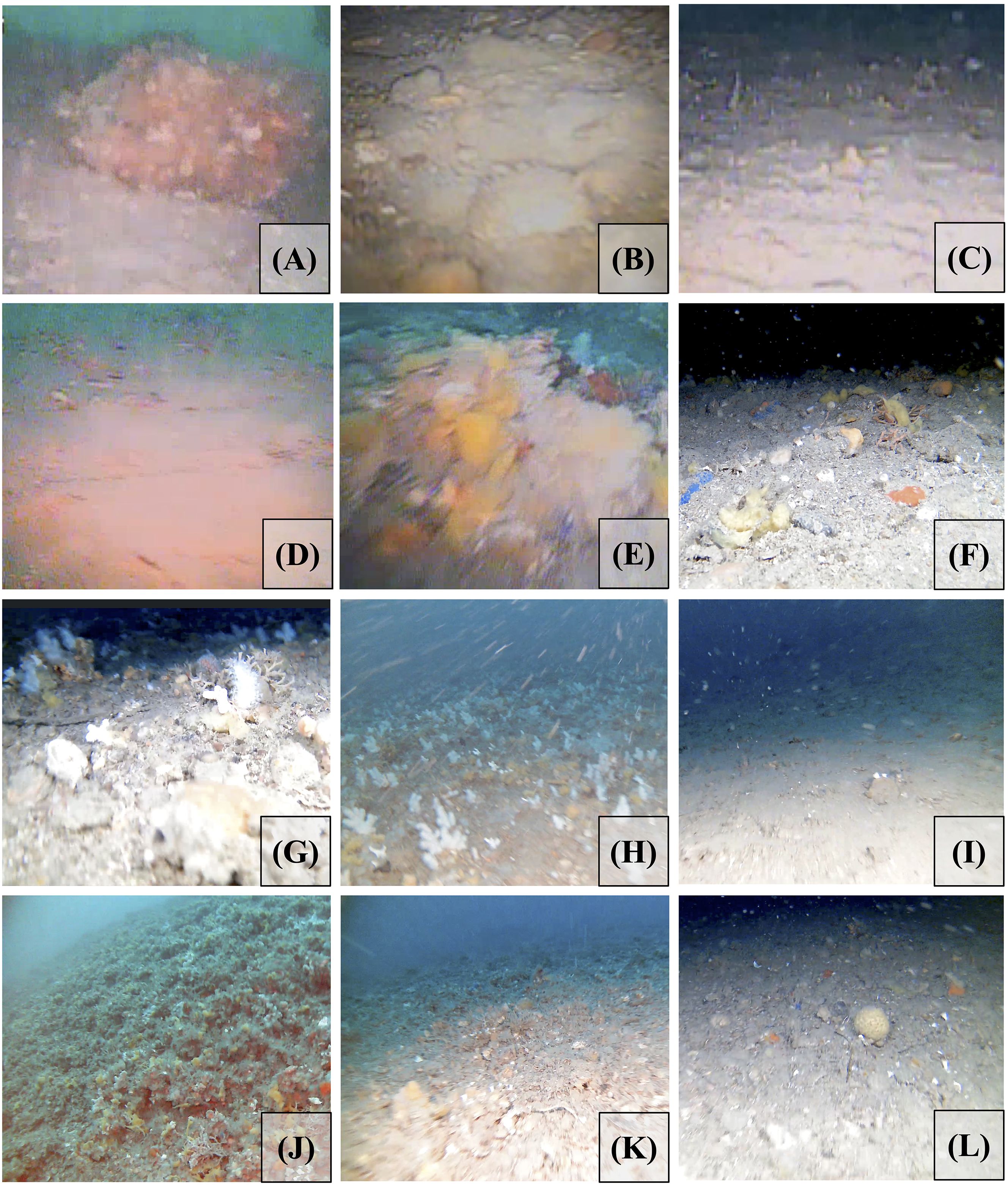 Figure 6. Photographs of the sea-bed in the Rion-Antirion Strait area. Panels correspond to different video transects. (A) Profile 1. (B) Profile 2. (C) Profile 3. (D) Profile 4. (E) Profile 5 and 6. (F) Profile 7 and 8. (G) Profile 9, image 1 (before the Alcyonium spp. field). (H) Profile 9, image 2 (inside the Alcyonium spp. field). (I) Profile 10. (J) Profile 11, image 1 (during the mount). (K) Profile 11, image 2 (after the mount). (L) Profile 12.
