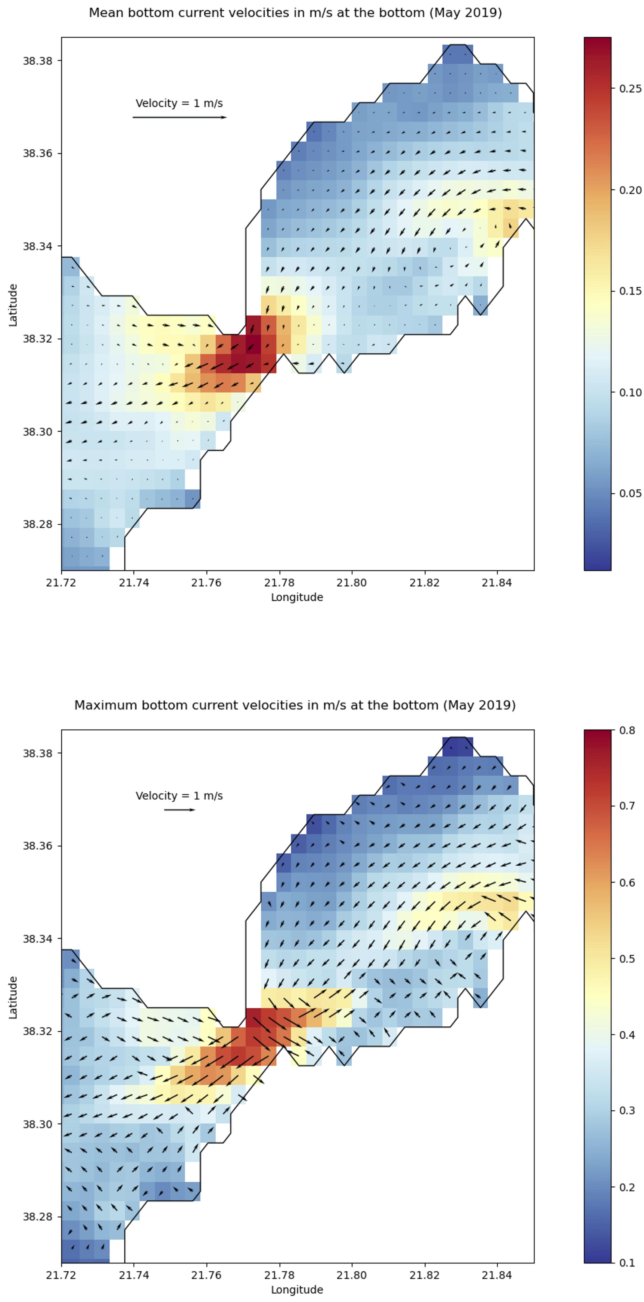 Figure 7. Top: mean direction and intensity (m/s) of bottom currents in the Rion-Antirion Strait during May 2019. Bottom: direction and intensity of the strongest bottom currents for the same period.