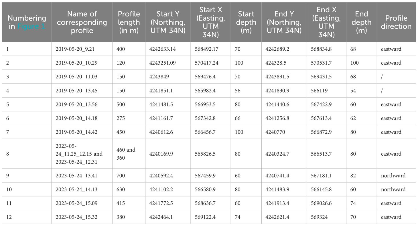 There were two data acquisition campaigns: May 2019 and May 2023. For this study, we used 2019 MBES (multibeam echosounder) data proceeded and interpreted by Rubi et al. (2022), together with video footage from both 2019 and 2023. MBES data was used to generate a 5 m × 5 m bathymetric grid covering 211 km², which Rubi et al. (2022) used to identify megahabitats and mesohabitats (km to 10 m), while macro- and microhabitats (10 m to <1 m) were identified here from video footage. Video footage was the only way to characterize the biotope, as the study area shows strong and variable bottom currents (Rubi et al., 2022; Caterina et al., 2025), that prevent the use of ROVs (Remotely Operated Vehicle) or in situ sampling. Consequently, seabed images were acquired using a Towed Underwater Camera System (TUCS). Twelve (12) video transects were carried out along the various seabed types and particularly within the megahabitats and mesohabitats of the survey area. In 2019, the camera had a resolution of 640x480, while in 2023, an HD camera (1920x1080) was used. During both campaigns, the boat drifted at a constant speed of 1–2 knots. In 2019, biotope image acquisition consisted of seven transects (Figure 1; see Table 1). GPS coordinates (accurate to ~10 cm) were embedded in the videos and correspond to the boat’s position. Recordings were made on 20 May at 9:21 am, 10:29 am, 11:03 am, 1:45 pm, 1:56 pm, 2:18 pm, and 2:42 pm. The 2023 acquisition was conducted from 12 to 26 May with five transects recorded on 24 May at 11:25 am, 12:15 pm, 12:31 pm, 1:41 pm, 2:13 pm, 3:09 pm, and 3:32 pm, with the first three grouped as a single profile (Figure 1; Table 1). GPS coordinates, recorded every second, correspond to the boat’s position. Coral positions along transects may deviate by over one meter due to the flexible, non-rigid cable linking the boat and the camera. Transects are named after the acquisition start time (Table 1).