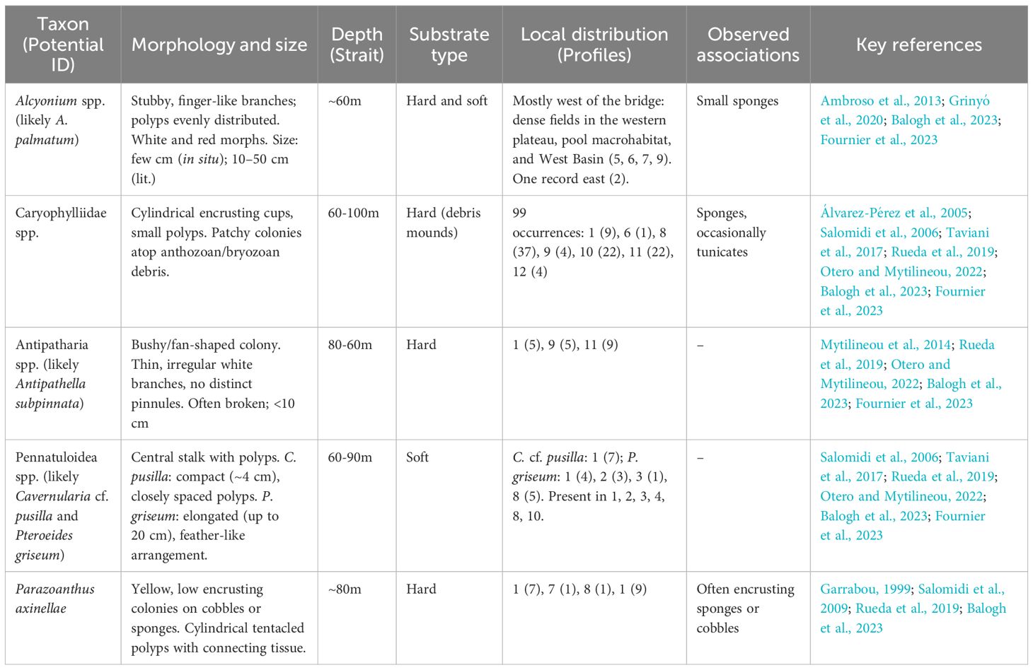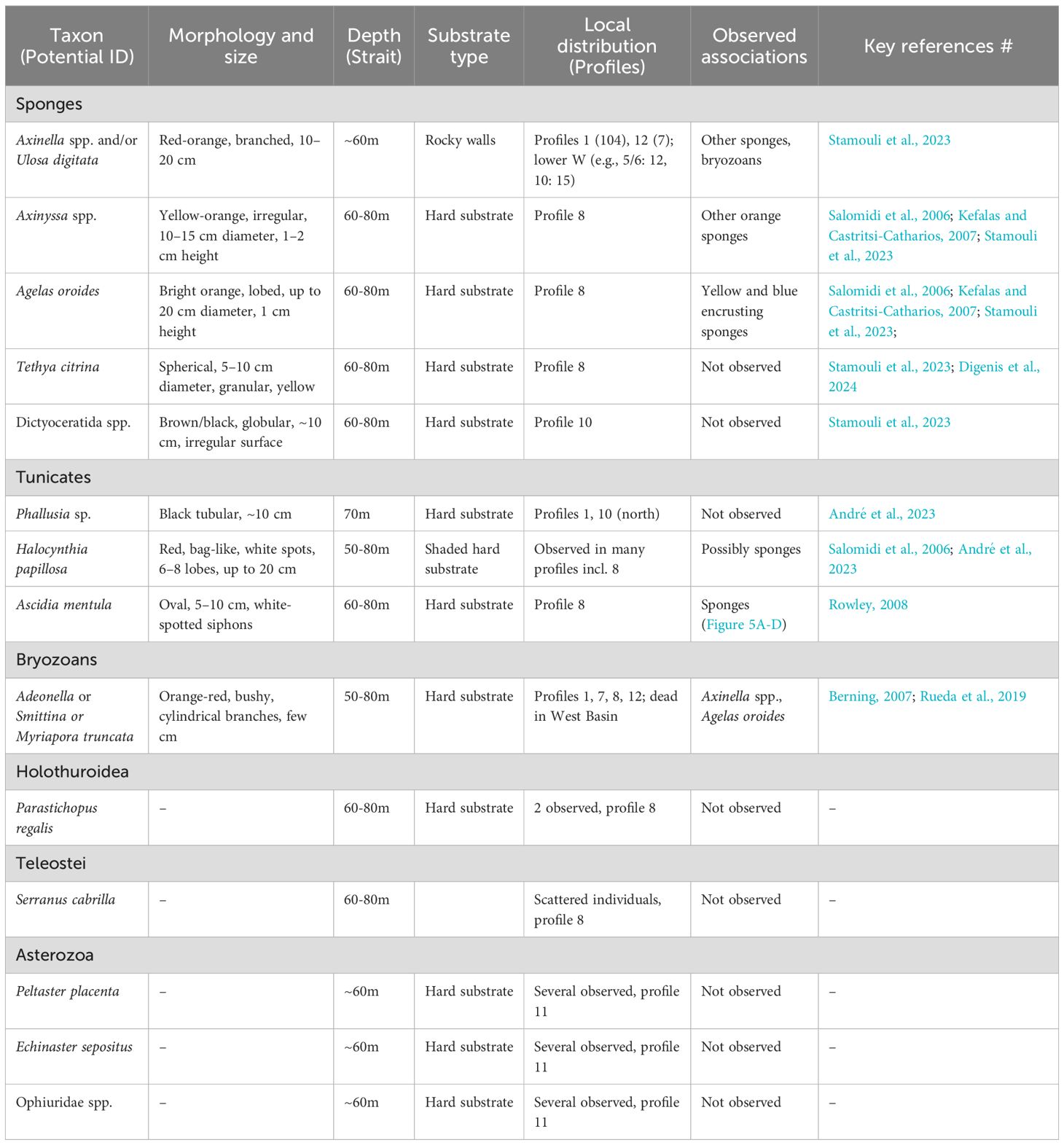The marine biotopes and associated assemblages in the Rion-Antirion Strait (i.e., corals, sponges and tunicates) were identified by video analysis. Each video was viewed more than four times, frame-by-frame. MAF locations were mapped using QGIS software. As no physical samples were collected, identification was based exclusively on visual characteristics following a non-invasive approach. We relied on databases and current literature sources documenting benthic invertebrates from similar environments in various ecoregions of the Mediterranean Sea (e.g., Álvarez-Pérez et al., 2005; Salomidi et al., 2006; Kefalas and Castritsi-Catharios, 2007; Taviani et al., 2017; Rueda et al., 2019; Otero and Mytilineou, 2022; André et al., 2023; Balogh et al., 2023; Fournier et al., 2023; Stamouli et al., 2023). Nevertheless, this method limits accurate species-level identification, which typically requires microscopic analysis of physical samples. Summaries of identified benthic species are found in Tables 2, 3.
