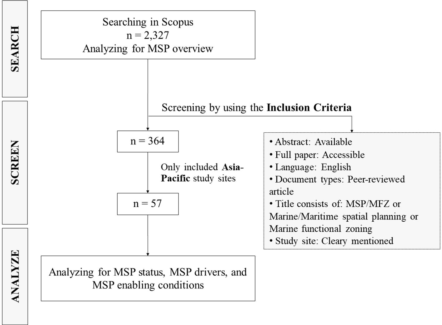 This study applied a systematic review to examine MSP development in the Asia-Pacific, following four steps: (1) defining objectives and research questions; (2) developing a search protocol; (3) applying inclusion criteria; and (4) conducting content analysis and synthesis (Elrick-Barr et al., 2022; McLeod et al., 2021; Ferro-Azcona et al., 2019; Pittman and Armitage, 2016). Research objectives and guiding questions are presented in Table 1. The review was also partly informed by insights from the project “Marine Spatial Planning: Application to Local Practices” (Satumanatpan et al., 2023), which supported the initial scoping and development of the thematic framework.