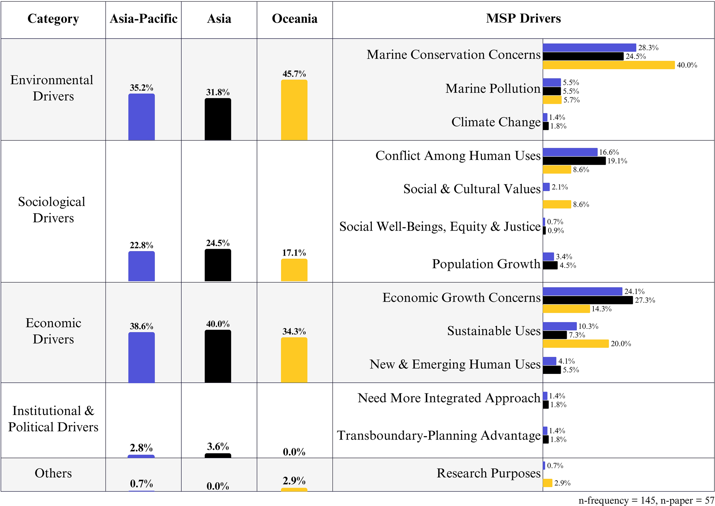 Content analysis revealed that economic drivers were the most frequently cited motivations for MSP implementation in the Asia-Pacific (38.6%), including economic growth (24.1%), sustainable use (10.3%), and new marine uses such as offshore aquaculture and energy (4.1%). (see Figure 2). Environmental drivers followed closely (35.2%), led by marine conservation (28.3%), with sociological drivers (22.8%) emphasizing user conflict and population pressures. Institutional, political, and research-related drivers were rarely mentioned (2.8% and <1%, respectively) (Wang et al., 2022a; Gacutan et al., 2022).