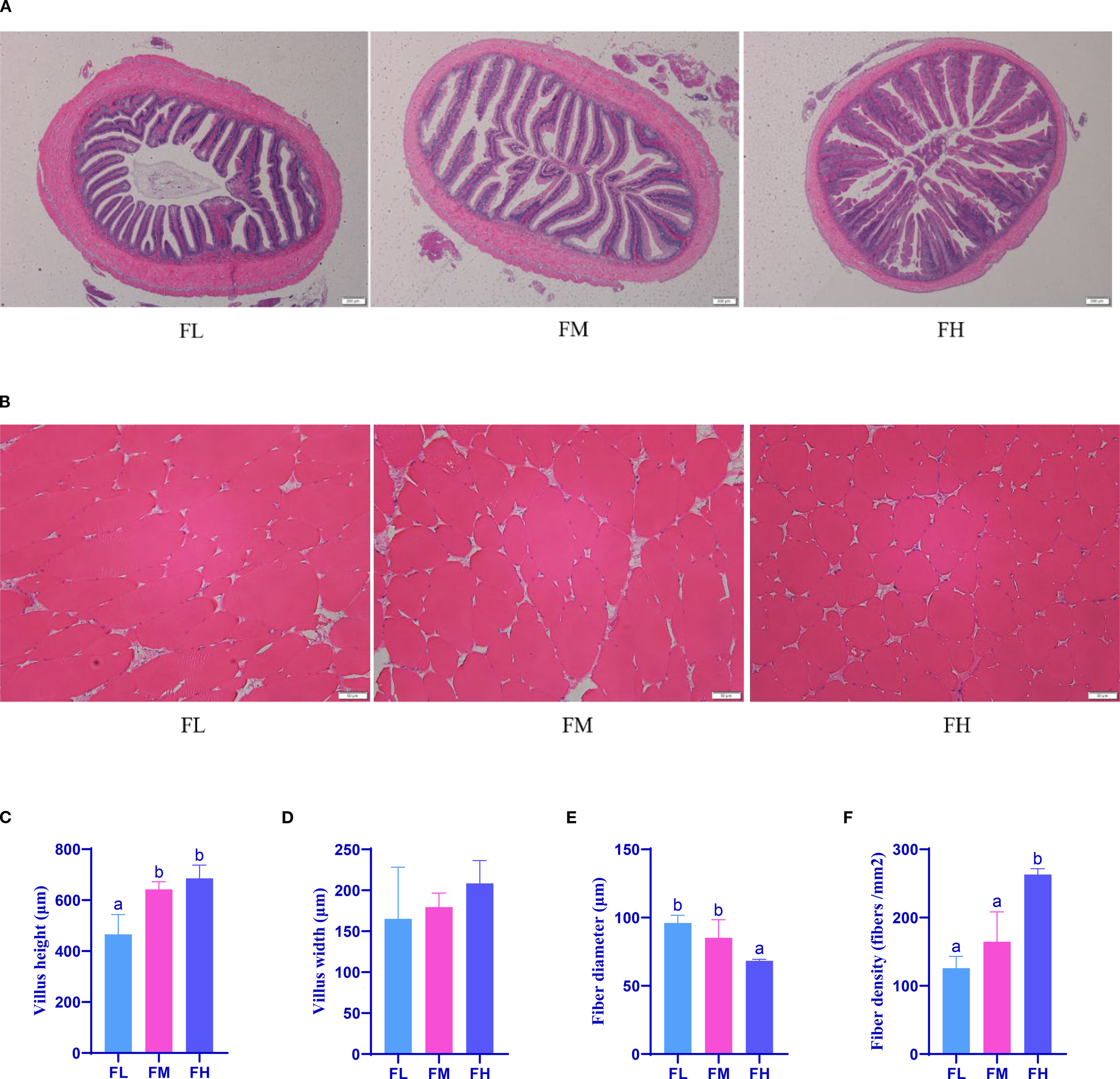 Effect of dietary fishmeal on tissue morphology of grass carp. Note: (A) Images of hematoxylin and eosin-stained sections of the posterior intestines of grass carp. (B) Images of hematoxylin and eosin-stained sections of the dorsal muscle of grass carp. (C) Effect of dietary fishmeal on grass carp villus height. (D) Effect of dietary fishmeal on grass carp villus width. (E) Effect of dietary fishmeal on grass carp dorsal muscle fiber diameter. (F) Effect of dietary fishmeal on grass carp dorsal muscle fiber density. FL: grass carp fed diet without fishmeal; FM: grass carp fed diet with 3% fishmeal; FH: grass carp fed diet with 6% fishmeal. Value with different superscripts are significantly different (P< 0.05, n ≥ 3).