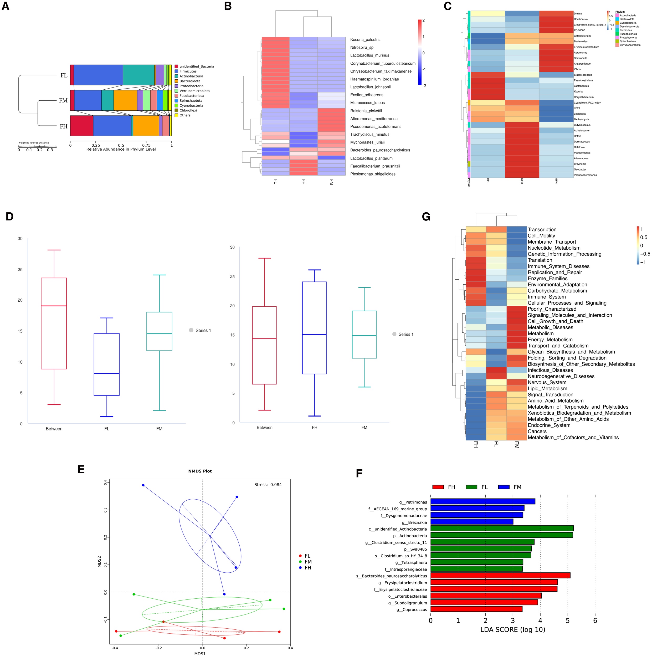 Effect of dietary fishmeal on intestinal microflora of grass carp. Note: (A) UPGMA clustering tree depicting all intestinal microbiome samples. Only the top 10 most abundant (based on relative abundance) bacterial phyla are displayed in the figures. (B) Heatmap of relative abundance (top 10 species at the species level). (C) heatmap of species abundance clustering. Only the top 30 most abundant bacterial genera (based on relative abundance) are shown in the figures. (D) ANOSIM analysis of dietary fishmeal on intestinal microflora of grass carp: FL vs. FM (left) and FM vs. FH (right). (E) NMDS analysis of dietary fishmeal on intestinal microflora of grass carp. (F) LEfSe analysis of dietary fishmeal on intestinal microflora of grass carp. (G) PICRUST (level2) analysis of dietary fishmeal on intestinal microflora of grass carp (Top 35). FL: grass carp fed diet without fishmeal; FM: grass carp fed diet with 3% fishmeal; FH: grass carp fed diet with 6% fishmeal.
