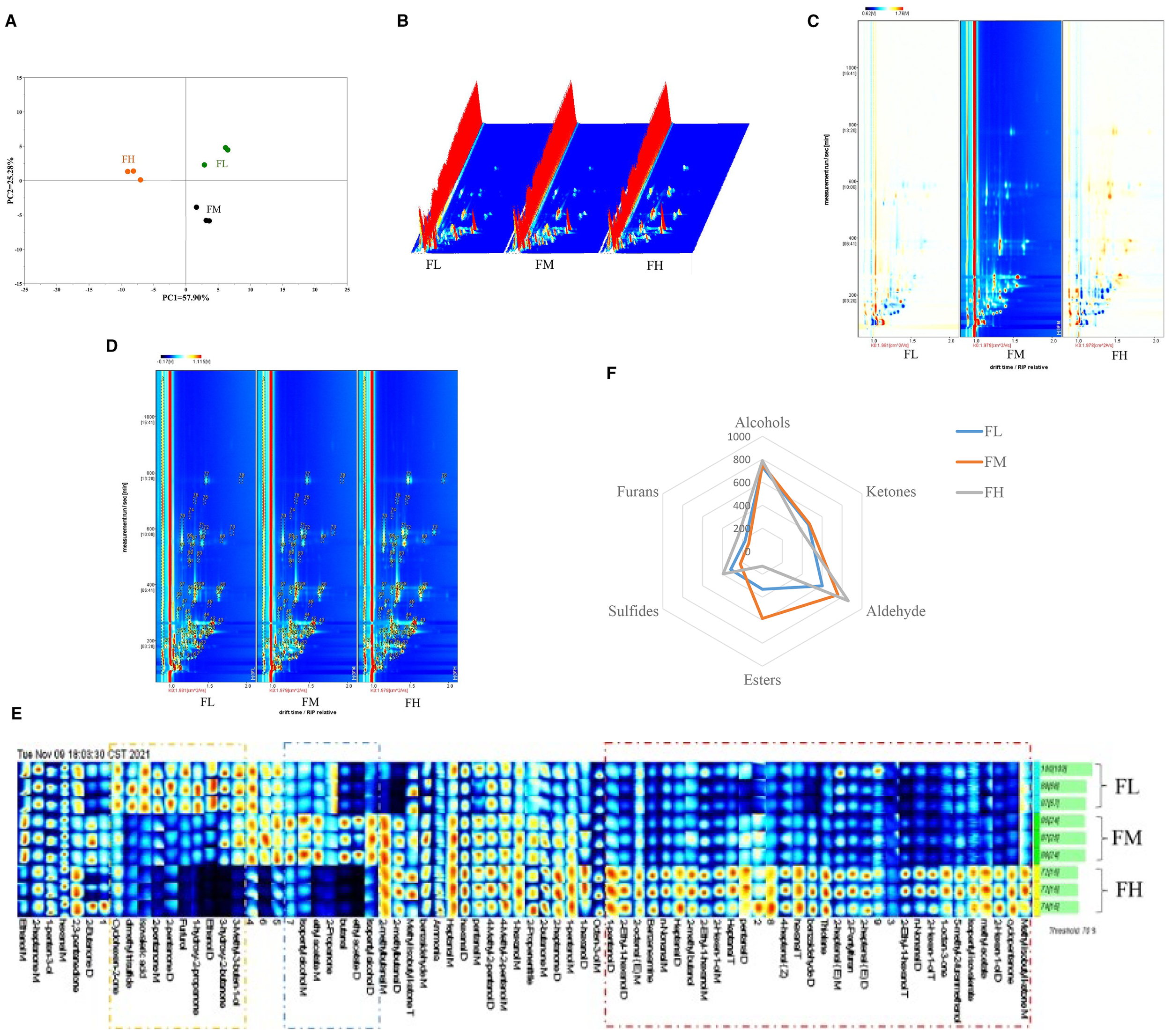 In Figure 3A, the PCA model is selected as the separation model. Samples with similar aroma characteristics overlap or are closely positioned in their respective figures (Song et al., 2020). The cumulative variance contribution rate of PC1 (57.9%) and PC2 (25.28%) is 83.18%, indicating that these two PCs essentially cover the sample information and can characterize the odor composition of grass carp muscle at different fish meal levels (Pan et al., 2022). A distinct separation is observed between the samples of the FH group and the other samples along PC1 (57.9%), indicating that the odor changes in muscle samples with a high level of fish meal are more pronounced.