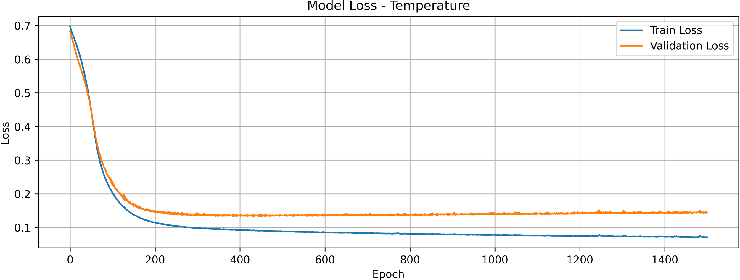 Loss curve generated during the temperature training and validation phase. The blue curve shows the loss for the training dataset, the orange curve depicts the loss for the validation dataset.