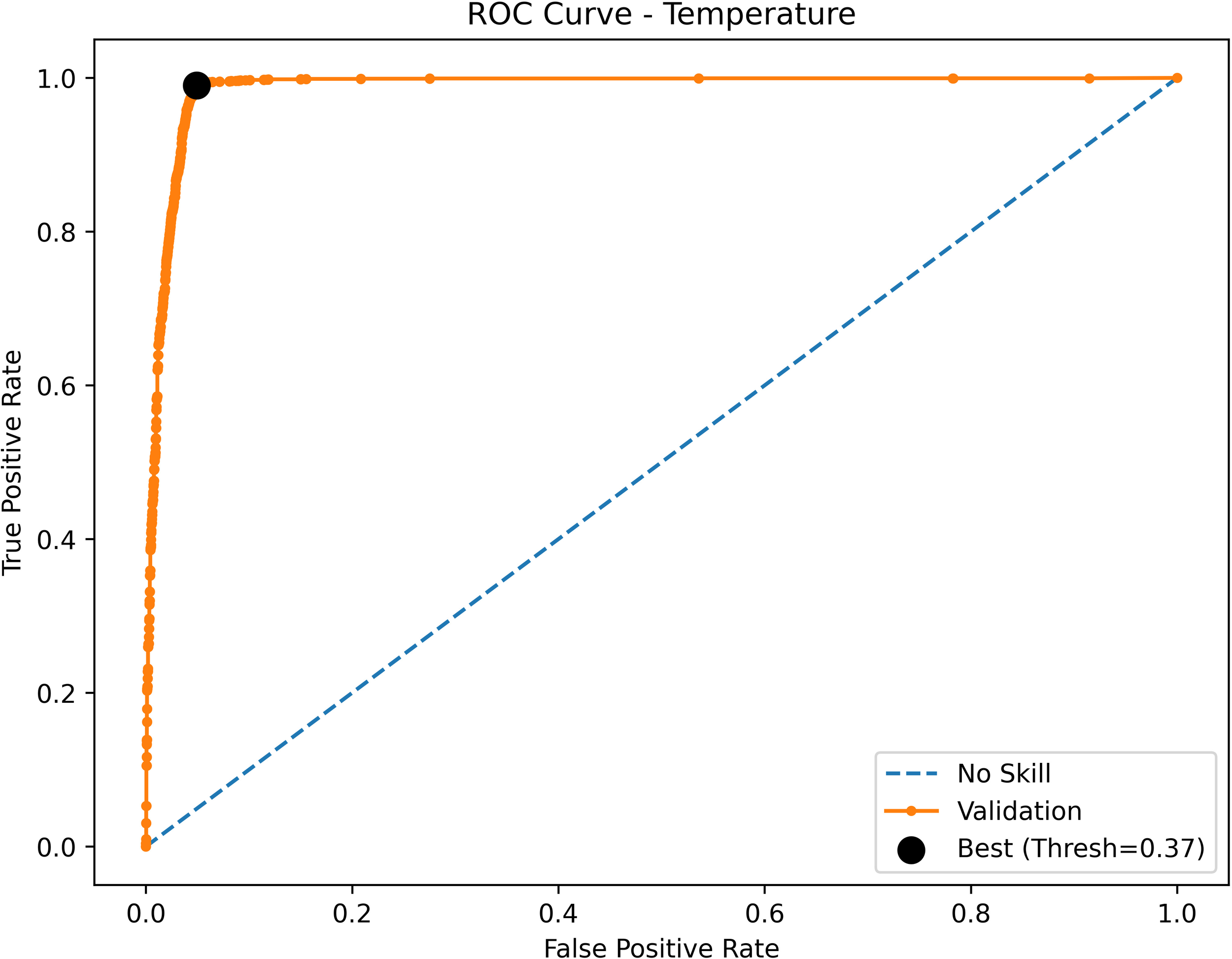 A crucial aspect in machine learning is the evaluation of the loss curve, which is generated during the model training and validation phases. Figure 1 shows the loss curve for the temperature QC. The loss curve represents a measure of the error between predicted classes and actual classes (“good” and “bad”), where we used the binary cross-entropy as loss function. The blue curve in Figure 1 represents the loss during the training – the decrease over the training epoches indicates that the model is indeed “learning”. The orange curve depicts the loss of the model applied during training to the validation dataset, which is not used for the training, hence unknown to the model. The orange curve follows very closely the blue curve, which indicates that the model is nearly as good on unknown data as on training data, which depicts the success of the training. At a certain point an increase is expected, happening when the model starts “learning” the noise pattern in the training set, which is different in the validation set, and thus cannot be predicted by the model. This is the optimal point to stop the training. Another important metric is the ROC curve, illustrated in Figure 2, which provides a graphical representation of the performance of the MLP. The curve plots the True Positive Rate (TPR) against the False Positive Rate (FPR) at various classification threshold settings, offering insights into the trade-off between the TPR and FPR. The objective optimal classification threshold is given by the most top-left point in the curve, which we use accordingly. Thus, the ROC handles the imbalance of the data as well as the confidence of the model by choosing a classification threshold different than 0.5, which would be used in a case of class balance. Here, for temperature, the best threshold is observed at 0.37. Finally we show the confusion matrices for the classical algorithm and the SalaciaML-2-Arctic (MLP part), both applied to the test dataset, i.e. only “bad” classifications by the classical checks.