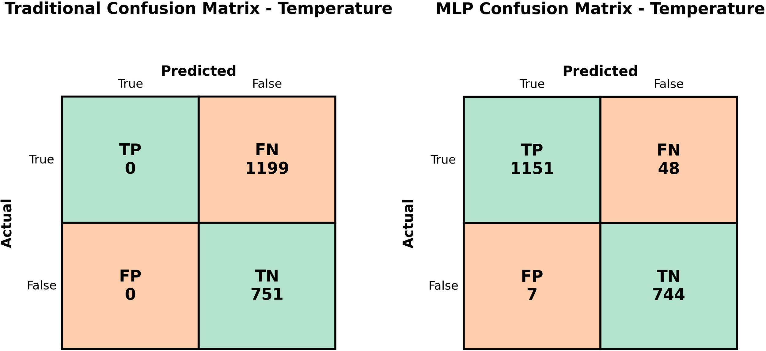 Confusion matrices for temperature. Left: classic algorithms, right: MLP, both applied to the test dataset.