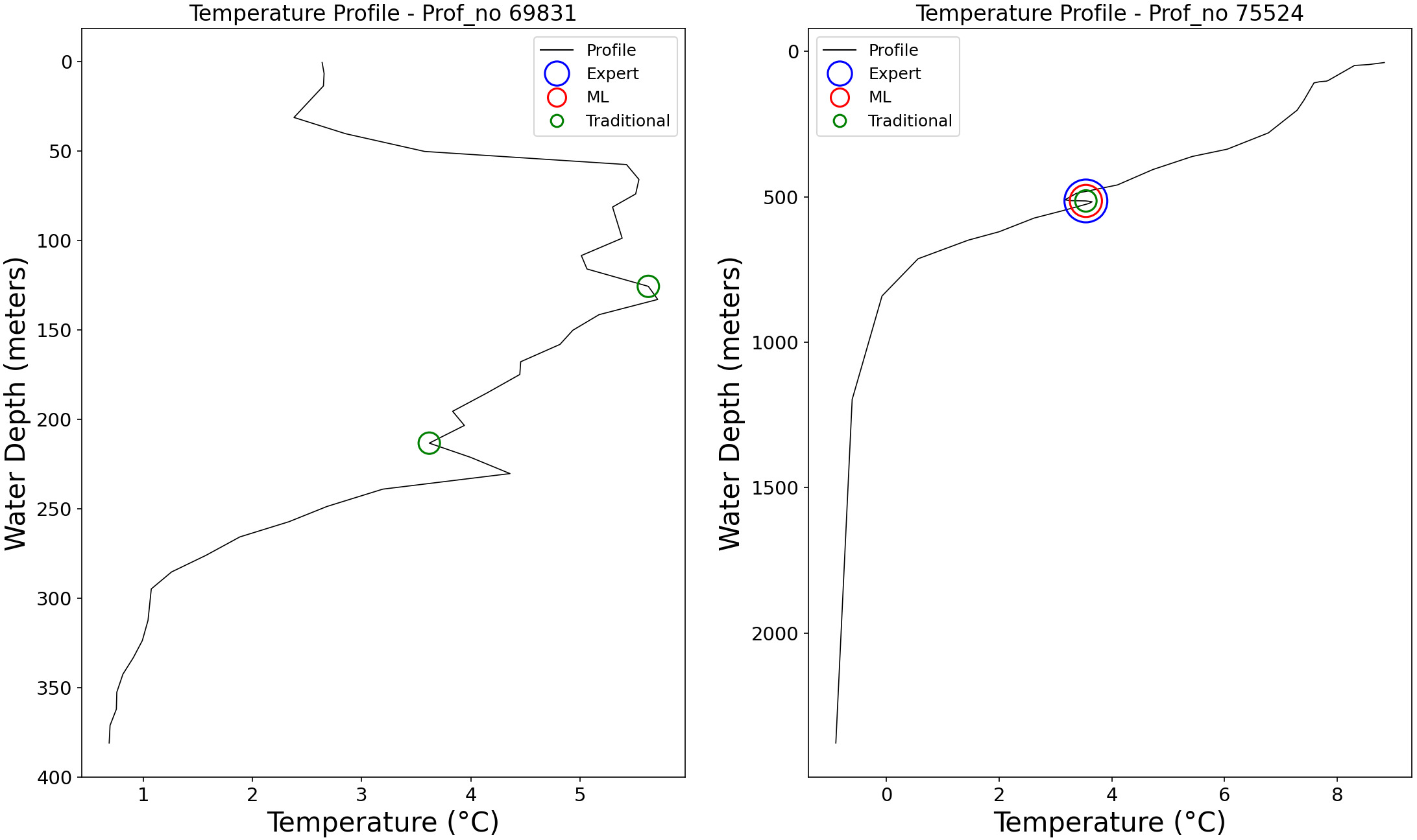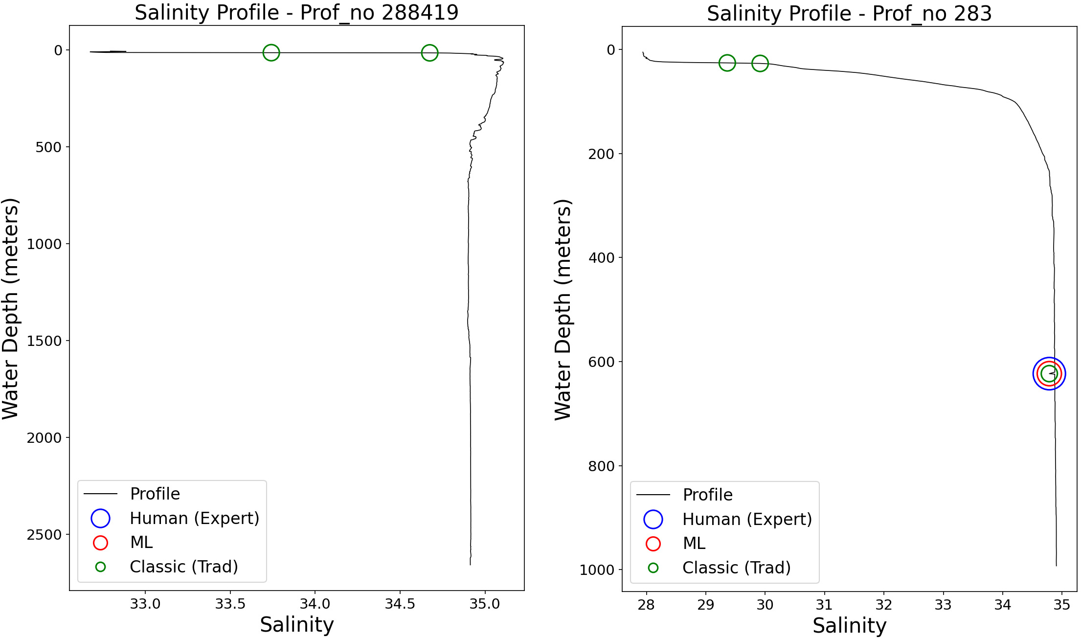 The left panel of Figure 4 shows a profile, where the classical check has identified two “bad” samples. The human expert however changed those back to “good” - we see no blue circle. Similar there is no red circle visible, indicating that the neural network changed the quality of that sample back to “good” as well. This is exactly the workload reduction, because in an operational setting using SalaciaML-2-Arctic, such a profile would have not been shown to the human expert, rather it would have been automatically accepted as “good”. Without the ML component a visual inspection of that profile would have been needed. The right panel of Figure 4 shows a profile, where the classic algorithm detects a “bad” sample, which is kept “bad” by the human expert (blue circle) and the MLP (red circle).