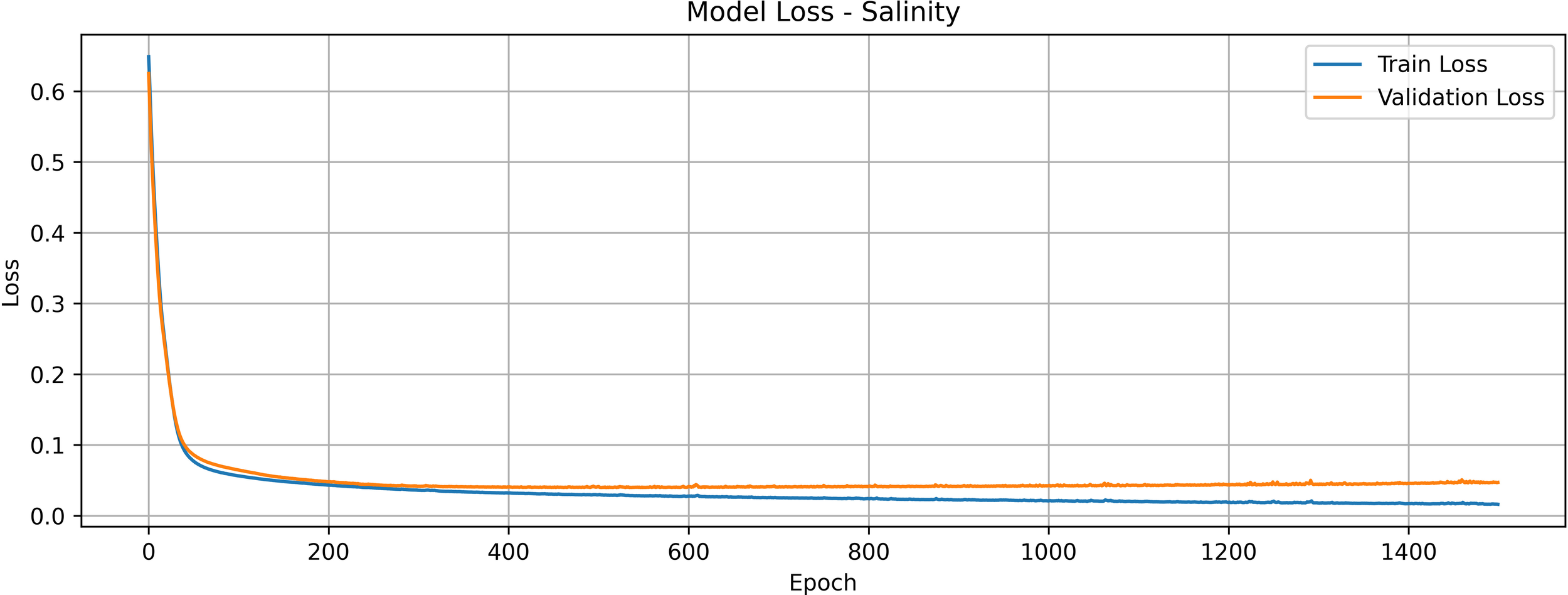 Loss curve generated during the salinity training and validation phase. The blue curve shows the loss for the training dataset, the orange curve depicts the loss for the validation dataset.