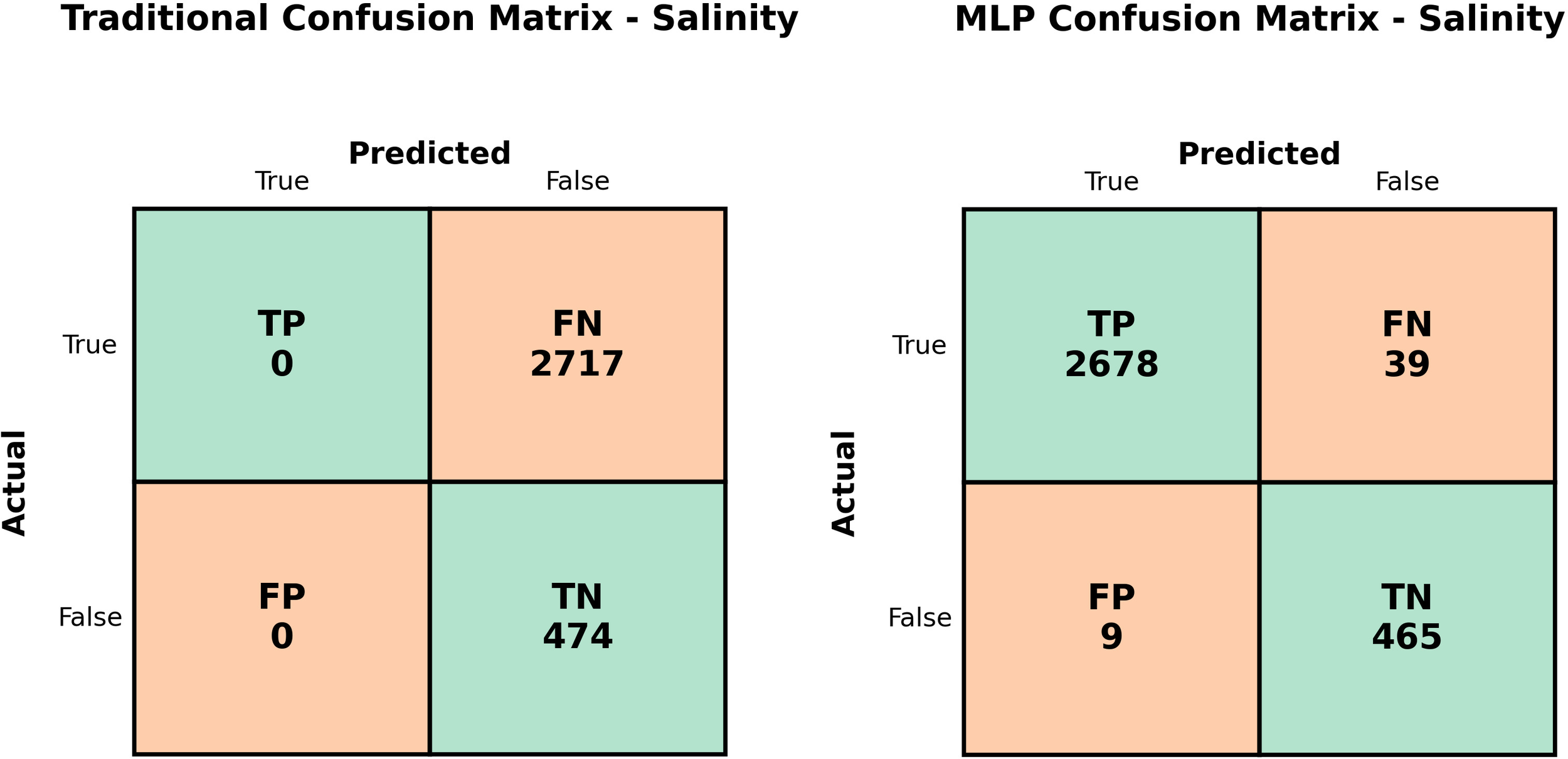 Confusion matrices for salinity. Left: classic algorithms, right: MLP, both applied to the test dataset.