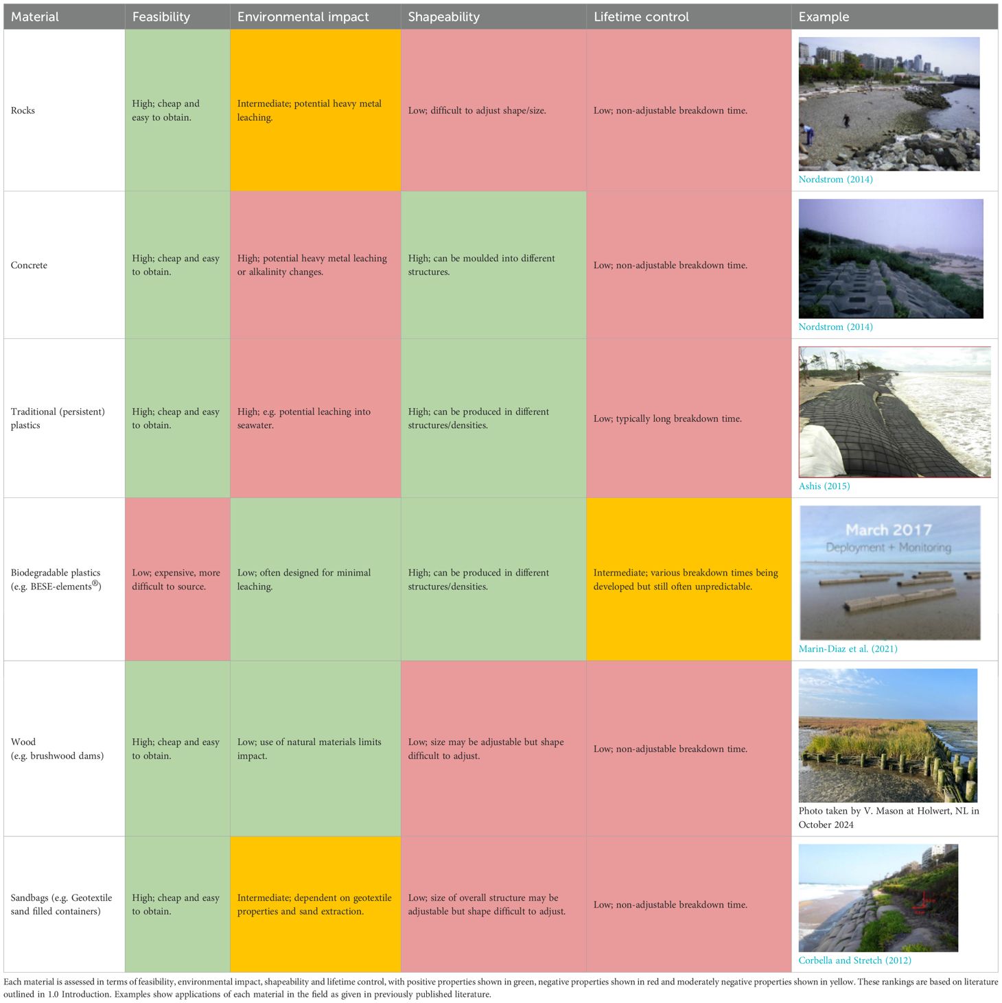1. Feasibility: rocks, wood, sandbags and concrete are easy to obtain in large quantities and therefore cheap and fast to deploy. However, biodegradable plastic alternatives, such as BESE-elements® (Marin-Diaz et al., 2021), ) can be more challenging to produce and can be more expensive (Nitsch et al., 2021). Currently, they are often more viable for smaller-scale projects. Such feasibility, or lack thereof, is crucial to the potential for upscaling material deployment to larger projects or a greater range of locations.
