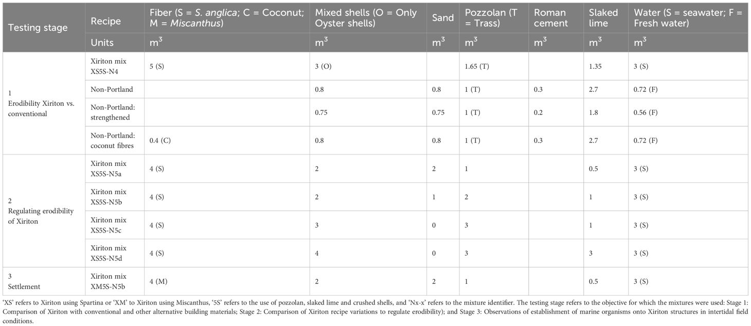 Here, we aimed to assess the applicability of Xiriton as an alternative nature-enriching material for NbS by creating Xiriton with a range of shapes and varying compositions of marine-sourced raw materials, by testing for the following key characteristics: i) erodibility, ii) compressive strength, iii) porosity, iv) pH, and v) establishment of marine organisms. Erosion of Xiriton blocks was compared with that of other novel hydraulic materials under raised hydrodynamic conditions in a fast flow flume. Furthermore, erosion of Xiriton blocks with varying compositions of marine-sourced raw materials and drying times was compared in the fast flow flume (rapid short-term erosion) and in-situ on an intertidal flat in a mesotidal environment (‘real time’ erosion). Additional material testing was carried out to compare the compressive strength, porosity and pH of different mixtures. Establishment of marine organisms on Xiriton blocks on the intertidal flat was also recorded over time. In doing so, we provided insight into the adjustability of erodibility of Xiriton mixtures alongside the potential for reef establishment. Gaining insight into each of these processes will contribute to the development and potential application of Xiriton within coastal engineering projects and NbS.