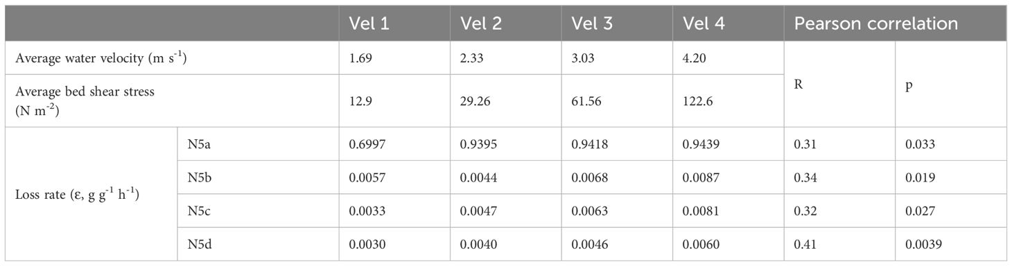 Table 3. The average water velocity (m s-1), bed shear stress (N m-2) and loss rate (g g-1 h-1) for every velocity experiment (Vel 1,2,3, and 4) with the Pearson correlation for the relation between the loss rate and bed shear stress for each mixture.