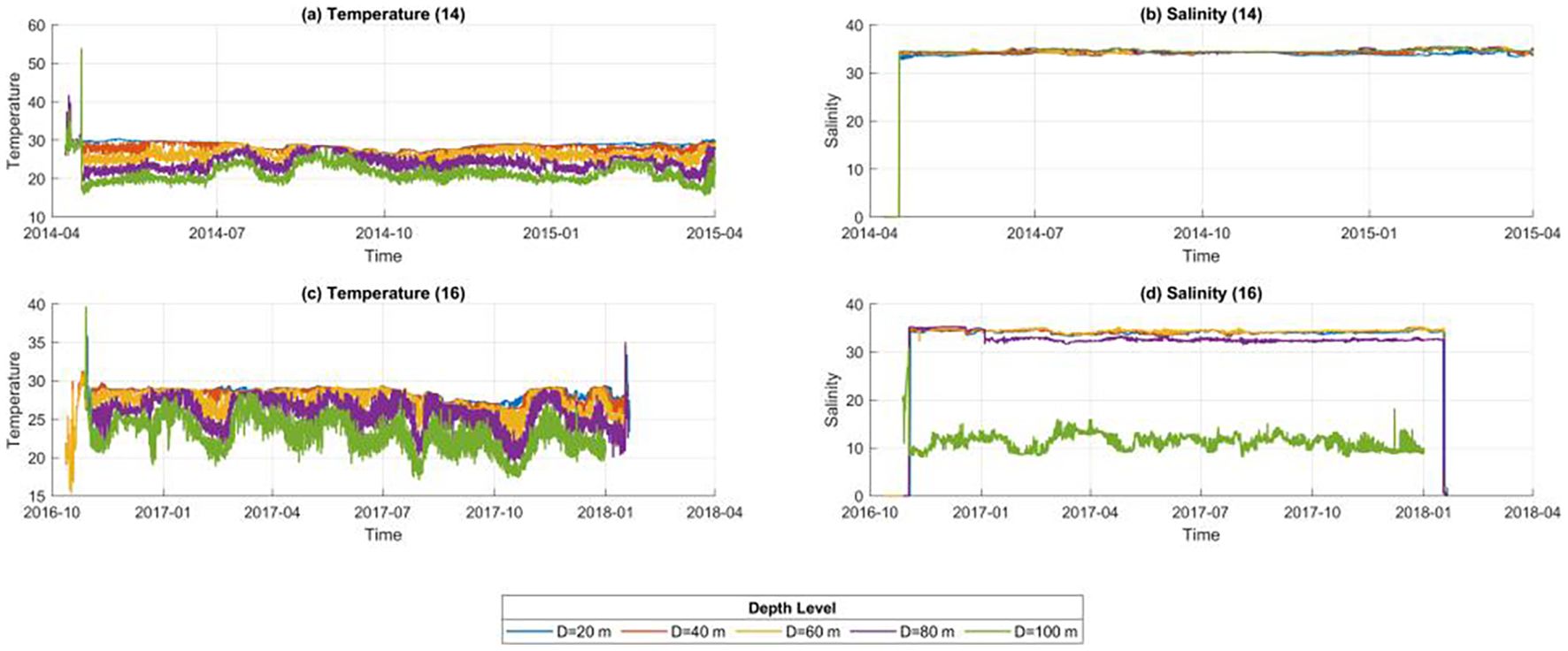 Figure 3. Distribution of BL01 buoy data [(a, b) Temperature and salinity data from 2014–2015; (c, d) Temperature and salinity data from 2016–2018].