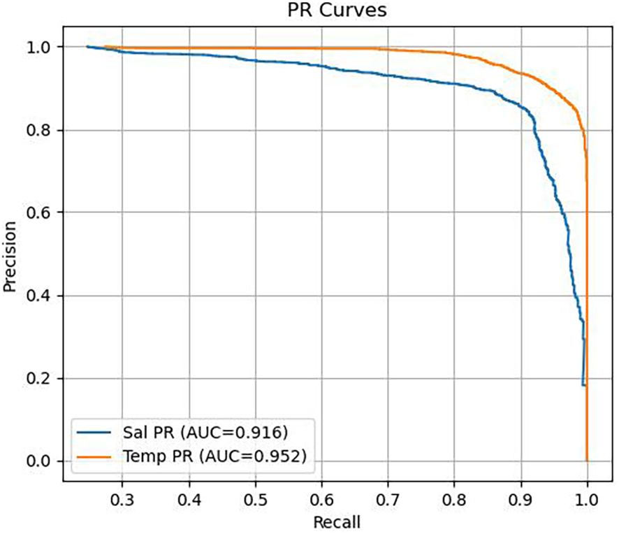 In this study, the model achieved a PR AUC of 0.952 in the temperature anomaly detection task and 0.916 in the salinity task, both of which were considered high-performance levels. These results indicated that the model not only effectively identifies the majority of anomalous samples (high recall) but also maintained a low rate of false positives (high precision).