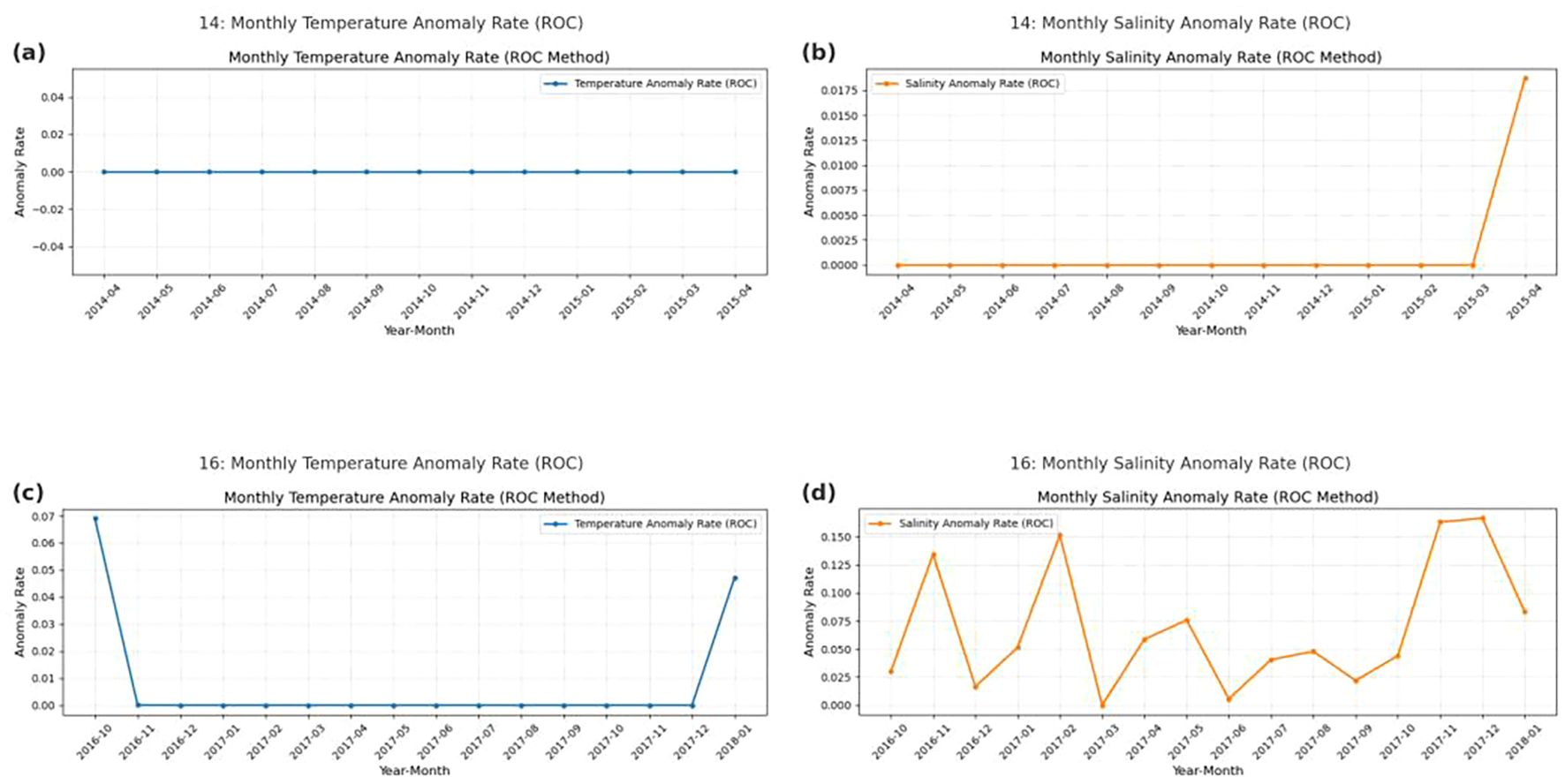 In comparison, Figure 11b presented a sudden spike in the salinity anomaly rate of Dataset14 in April 2015, rising to 0.0182, which might also be related to buoy recovery activities. Meanwhile, Figure 11d showed a multi-peak pattern in the salinity anomaly rate of Dataset16, with values reaching 0.1398 in November 2016, 0.1533 in February 2017 (the highest), 0.1647 in November 2017, and 0.1662 in December 2017. Other time points, such as April 2017 (0.0621), May 2017 (0.1006), and January 2018 (0.0857), also exhibited clear upward trends.