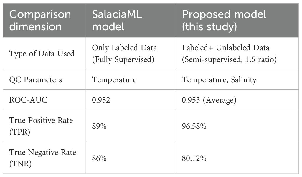 In performance evaluations, the semi-supervised model achieved an average ROC-AUC of 0.953 on the validation set, with a TPR of 96.58% and a TNR of 80.12%, demonstrating stable and reliable performance in both temperature and salinity anomaly detection. Furthermore, even when applied to a large volume of unlabeled data using pseudo-labels for auxiliary evaluation, the model maintained approximately 90% accuracy, reflecting strong label efficiency and generalization capability (shows in Table 3). In contrast, although SalaciaML achieved comparable results in some metrics, its applicability is limited to the temperature variable and is not effective on unlabeled data.