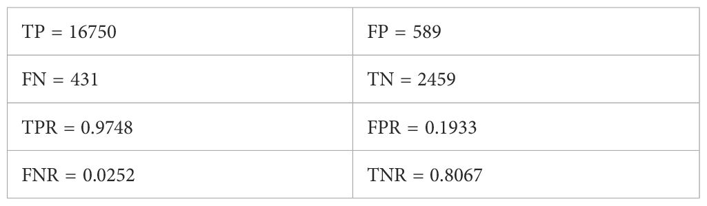 In the temperature quality control task, the model demonstrated excellent predictive performance (shows in Figure 9). Specifically, within the control dataset, the model correctly identified 16,750 normal samples (True Positives, TP), while 589 anomalous samples were incorrectly classified as normal (False Positives, FP). On the other hand, only 431 normal samples were mistakenly classified as anomalous (False Negatives, FN), and 2,459 anomalous samples were correctly identified (True Negatives, TN).