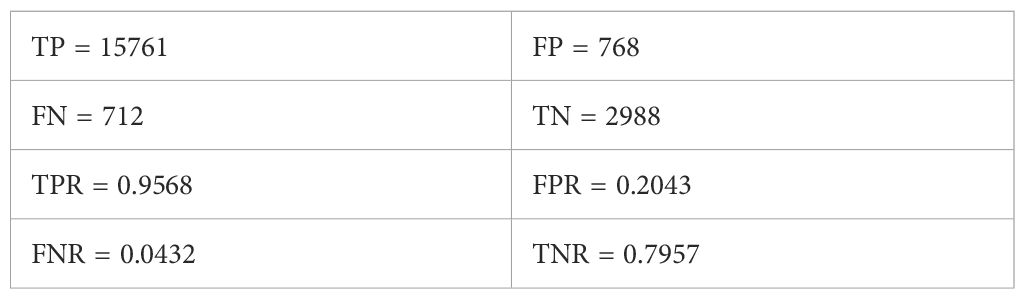 In the salinity quality control task, the model likewise demonstrated robust performance characteristics (shows in Figure 10). It successfully identified 15,761 normal samples (TP) and 2,988 abnormal samples (TN), while 768 abnormal samples were incorrectly classified as normal (FP), and 712 normal samples were mistakenly recognized as abnormal (FN).