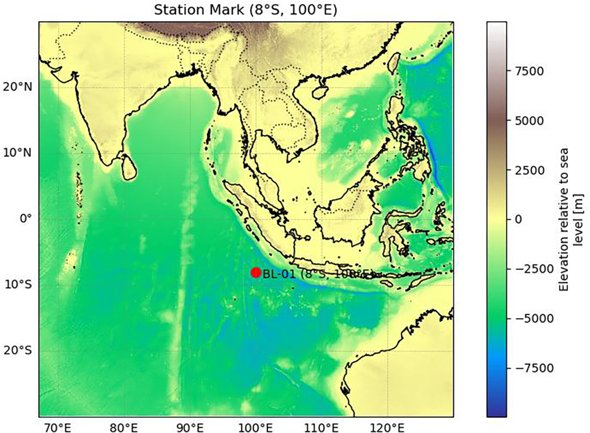 The Bailong-01 (BL01) buoy is a key fixed-point ocean observation platform deployed in the southern equatorial Indian Ocean warm pool under the RAMA program (Research Moored Array for African–Asian–Australian Monsoon Analysis and Prediction). It is located offshore to the southwest of Sumatra (see Figure 1 for detailed location). This region lies within the core area of tropical monsoon circulation and is influenced by a combination of oceanic processes, including the Indonesian Throughflow, seamount topography, and tropical gyre modulation (Sprintall et al., 2009), making it an important window for studying monsoon systems, oceanic dynamics, and climate variability. BL01 is capable of long-term, all-weather automatic observations. Its upper section is equipped with various meteorological sensors to measure and record air temperature, relative humidity, atmospheric pressure, wind speed, and wind direction. The lower section hosts multilayer oceanographic instruments, primarily including conductivity–temperature–depth (CTD) sensors and acoustic Doppler current profilers (Aquadopp), which acquire seawater temperature, salinity, and velocity data across multiple depth layers (Ning et al., 2022). The observation depth extends from the sea surface down to 700 meters. This study focused on the 20–100 m depth range, where sensor deployment is relatively dense and both temperature and salinity are measured in real time. This configuration offers high temporal and spatial resolution, making it particularly suitable for quality control and anomaly detection studies (see Figure 2 for the structure of the BL01 buoy).