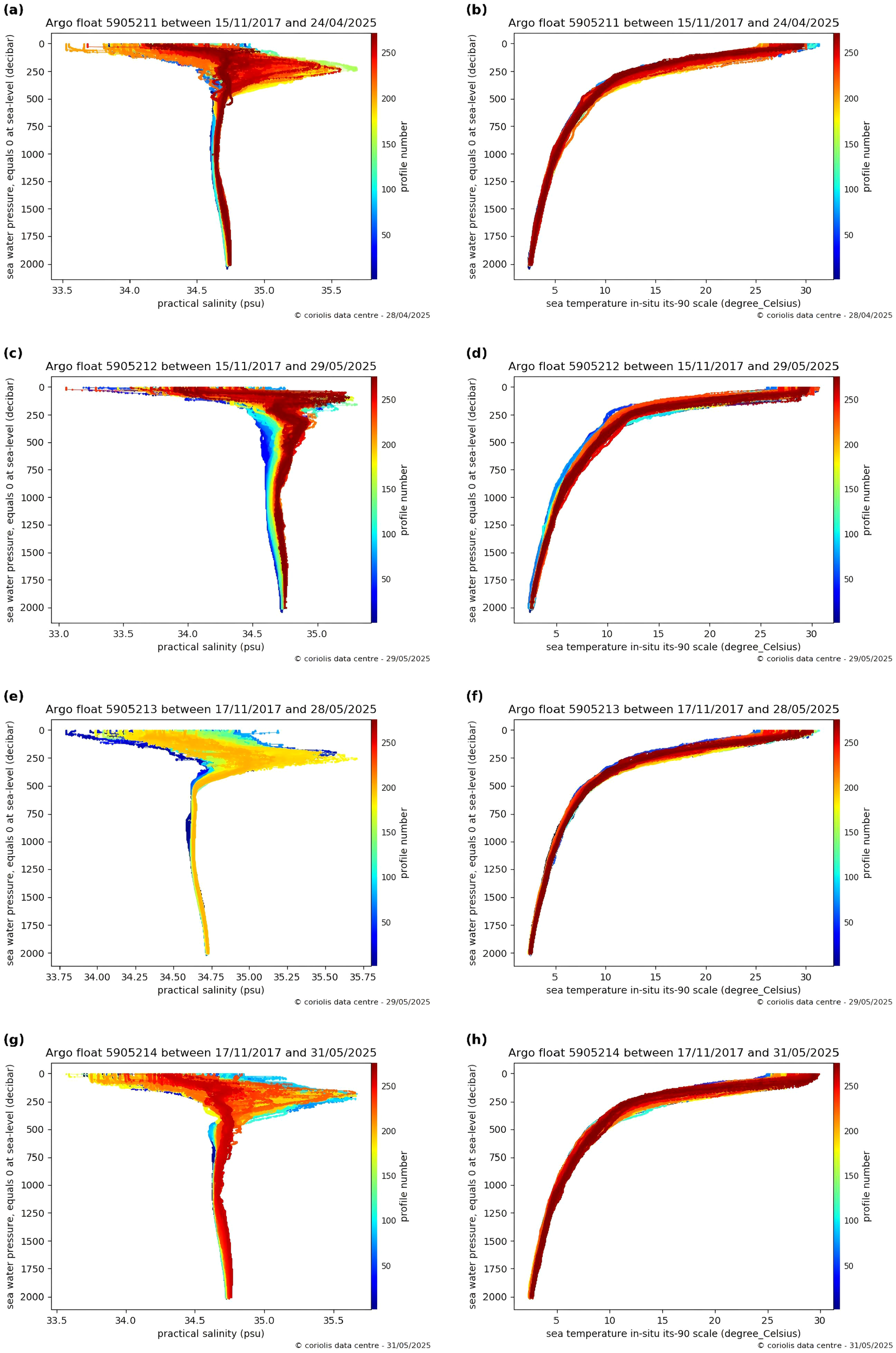 (a-h) Full-profile Argo float observations this figure presents the ocean profile observations from four Argo floats (IDs 5905211–5905214) collected between November 2017 and May 2025. It shows the variation of in situ temperature (ITS-90 scale, °C) and practical salinity (PSU) with depth (pressure, in dbar). In each subplot, color indicates the profile number, transitioning from blue (early observations) to red (later observations), thereby reflecting the temporal evolution of the dataset. Depth is plotted with 0 dbar at the surface, increasing downward. Only data from depths shallower than 130 m are used in this study. Data source: Argo float observations (IDs: 5905211–5905214), retrieved from the official Argo website [(https://argo.ucsd.edu) (https://argo.ucsd.edu)] via the Coriolis Data Center visualization tool, accessed in May 2025.© Argo Data Center. All rights reserved.