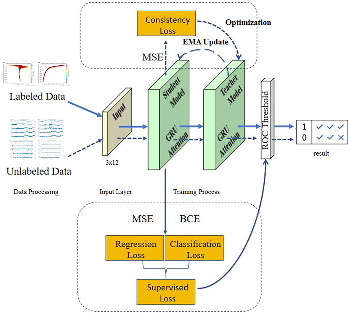 The network architecture adopted a two-layer GRU structure with 64 hidden units per layer, integrated with attention mechanisms and layer normalization to enhance feature representation and training stability. The training process was based on the Mean Teacher framework, in which the student model made predictions on perturbed inputs (e.g., with added noise), while the teacher model predicted on the same inputs without perturbations. The difference between these predictions formed the consistency loss, which encouraged the student model to align with the data distribution learned from unlabeled inputs.