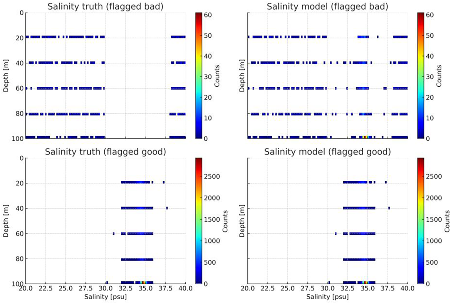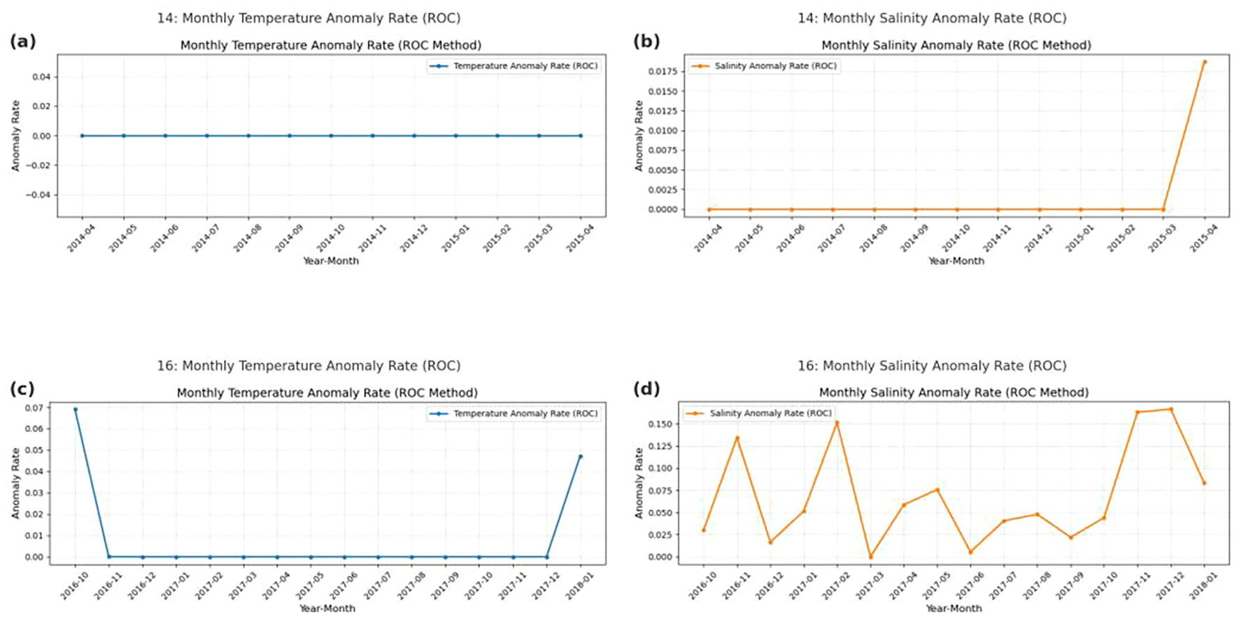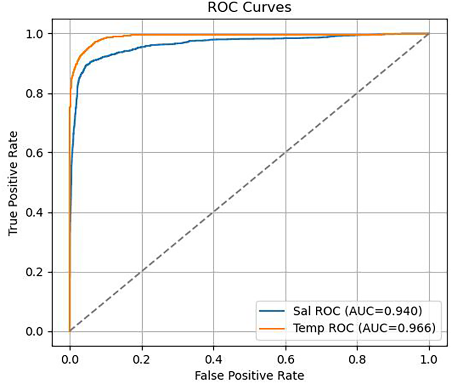 In this experiment, the model achieved an ROC AUC of 0.966 for temperature data and 0.940 for salinity data, both demonstrating strong classification performance. Notably, the model showed high sensitivity and specificity in detecting salinity anomalies.