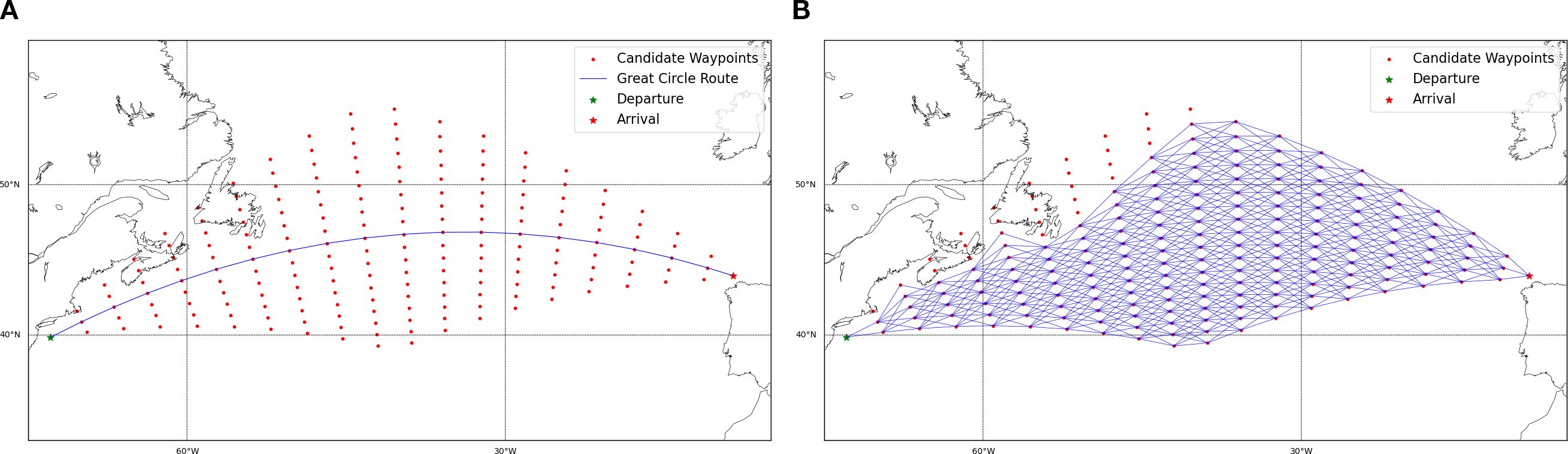 Based on (Equations 4–10), waypoints are calculated at intervals of n miles along the great-circle route and of n miles within a range of n miles perpendicular to the great-circle route. Each waypoint along the great-circle route thus has candidate waypoints , as indicated by the red dots in Figure 1A.