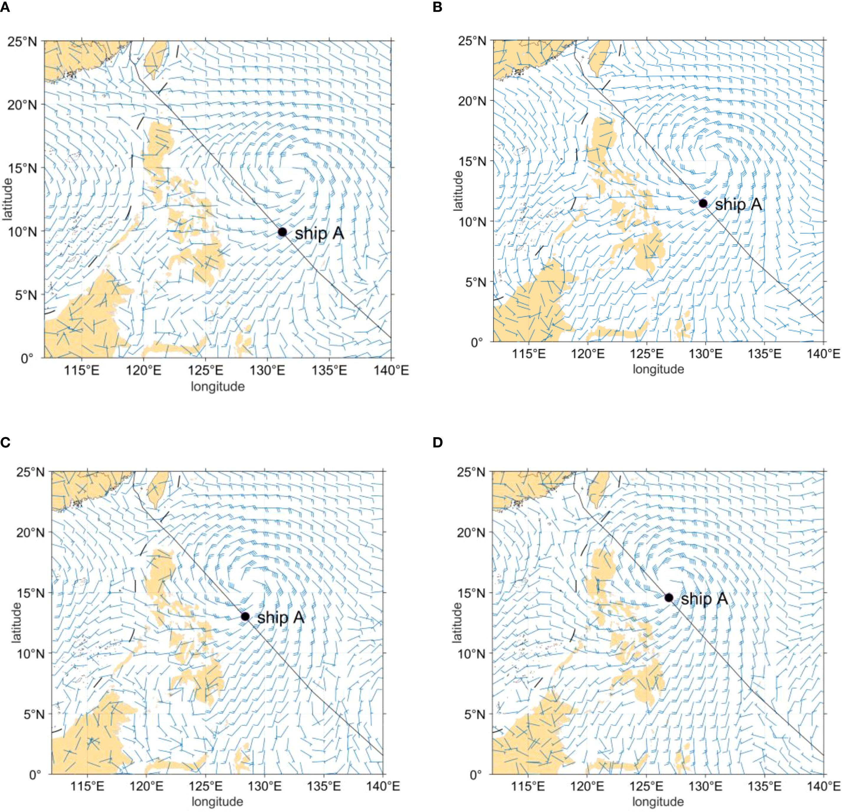 Figure 4. Forecast position of Ship A and wind field forecast. (A) 12UTC on 21st (B) 00UTC on 22th (C) 12UTC on 22th (D) 00UTC on 23th.