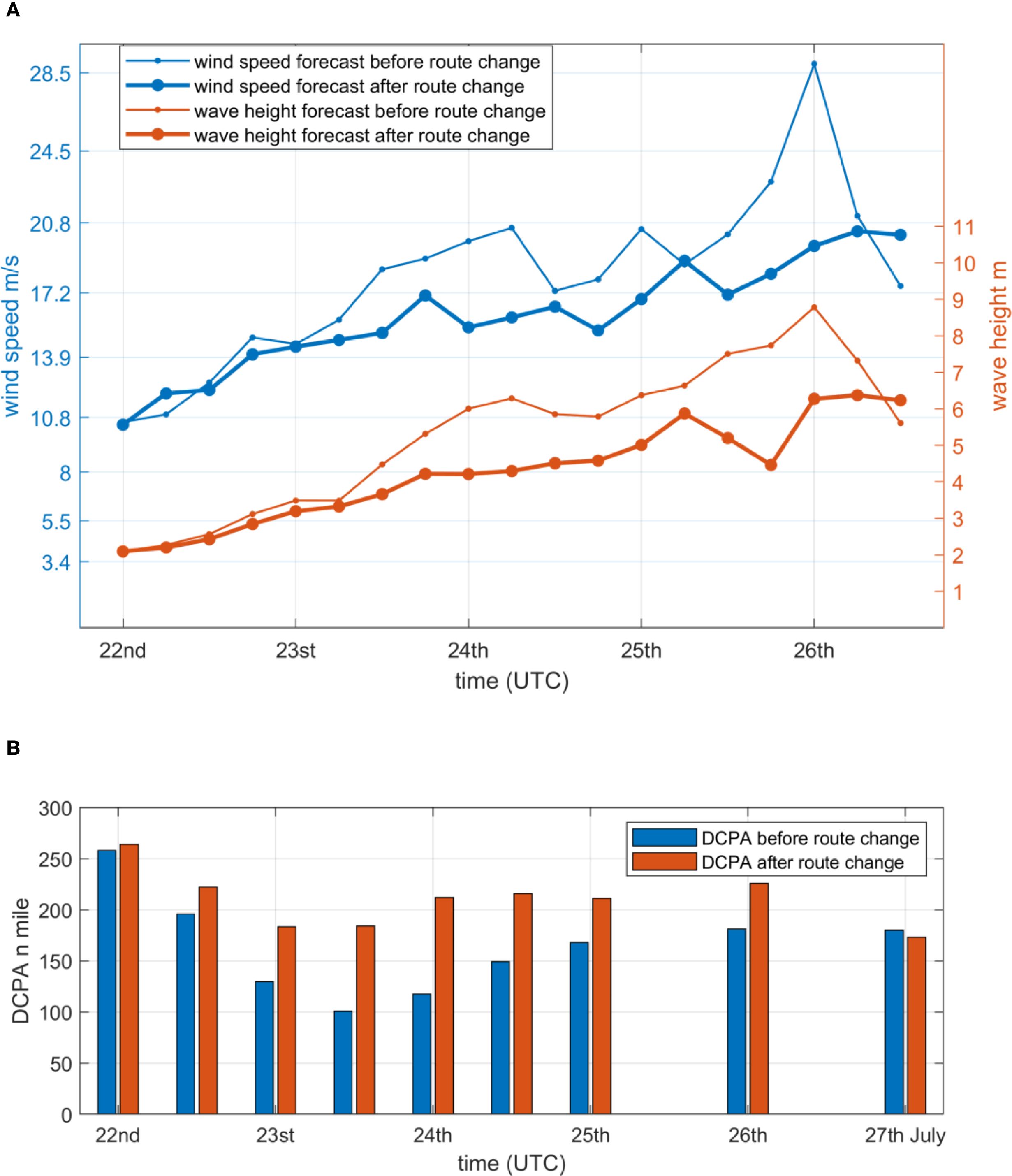 Figure 6. Comparison of wind and wave forecasts (A) and ship-typhoon distance before and after the ship route change (B).