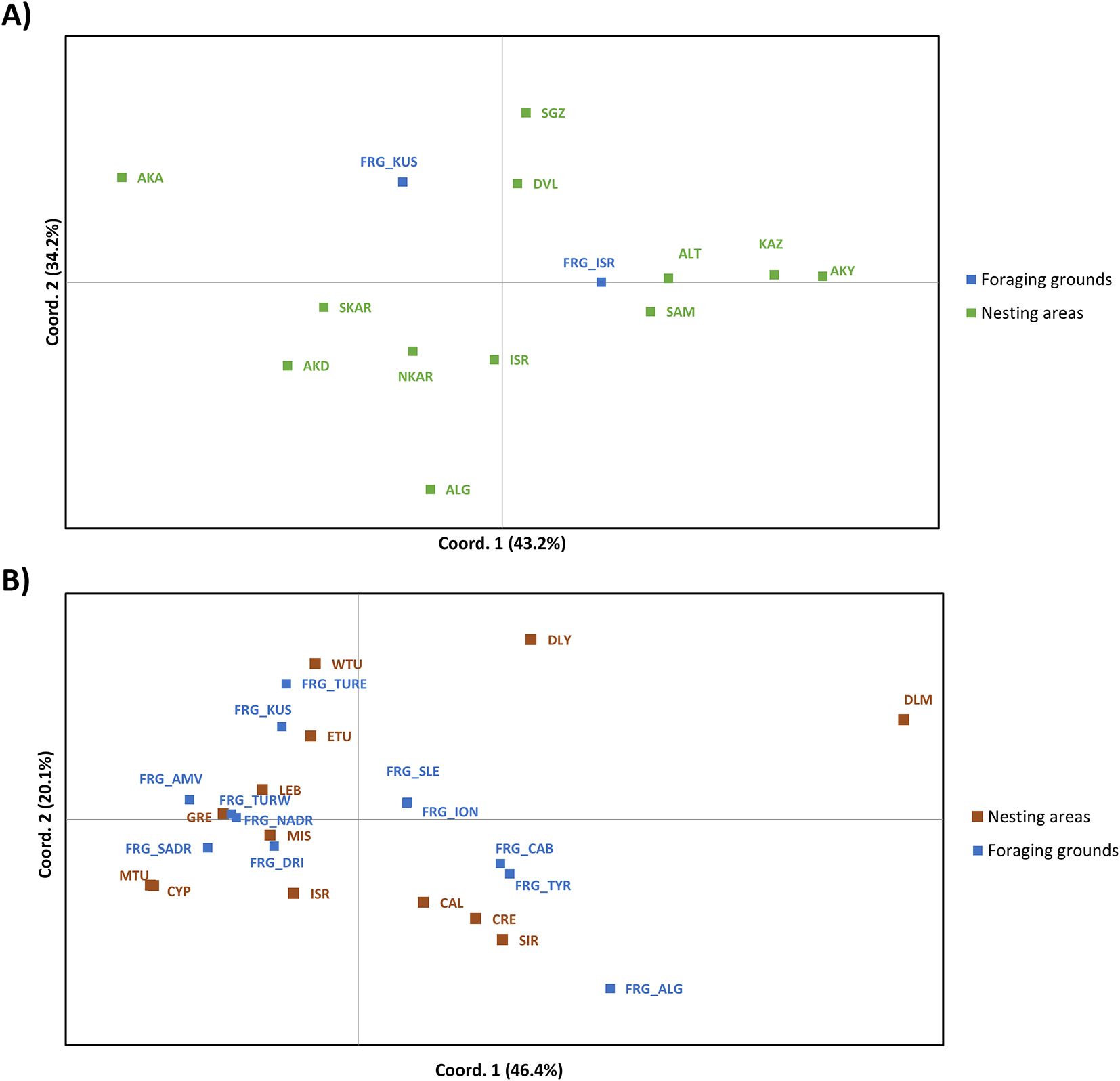 Figure 3. Principal coordinate analysis based on genetic distances (FST) between green turtles (A) and loggerhead turtles (B) in Mediterranean foraging grounds and nesting areas. The percentage of variation explained by each coordinate is included in brackets. For green turtles, nesting areas acronyms are AKA (Akamas), AKD (Akdeniz), ALG (Alagadi), NKAR (North Karpaz), SKAR (South Karpaz), ALT (Alata), DVL (Davultepe), KAZ (Kazanlı), AKY (Akyatan), SGZ (Sugözü) SAM (Samandağ), ISR (Israel); foraging grounds acronyms are KUS (Kuşadası Bay) and ISR (Israel). For loggerhead turtles, nesting areas are MIS (Misurata), SIR (Sirte), ISR (Israel), LEB (Lebanon), CYP (Cyprus), ETU (East Türkiye), MTU (Mid Türkiye), WTU (West Türkiye), DLM (Dalaman), DLY (Dalyan), CRE (Crete), WGR (West Greece) and CAL (Calabria); foraging grounds acronyms are the CAB (Catalano-Balearic Sea), ALG (Algerian basin), TYR (Tyrrhenian Sea), NADR (North Adriatic Sea), SADR (South Adriatic Sea), ION (Northern Ionian Sea), SLE (southern Levantine Sea), DRI (Drini Bay), AMV (Amvrakikos Gulf), TURW (Western Türkiye), TURE (Eastern Türkiye) and KUS (Kuşadası Bay) in blue.