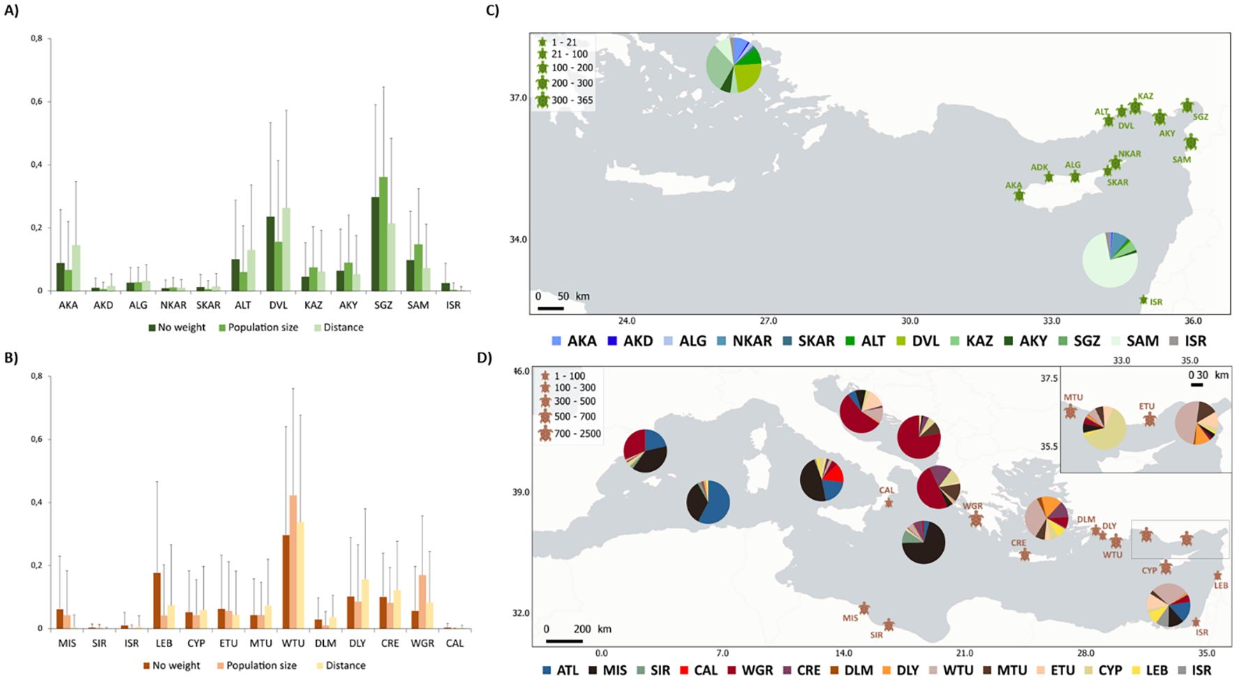 Figure 4. Mixed-stock analyses (MSA) of the individuals found along the Kuşadası Bay. Bar plots represent the percentage of turtles originating from each of the different nesting population groups for (A) loggerhead and (B) green turtles. Three different analyses were run, including (i) no weighting factor; (ii) population size as a weighting factor; and (iii) distance to the nesting area as a weighting factor. Error bars show the 95% confidence intervals. MSA estimated fine-scale nesting contributions (%) to Mediterranean green turtles (C) and loggerhead turtles (D) foraging grounds. Turtle size represents Mediterranean nesting population size; numbers indicate nest counts (nests/year). Nesting areas acronyms for green turtles (A, C) AKA (Akamas), AKD (Akdeniz), ALG (Alagadi), NKAR (North Karpaz), SKAR (South Karpaz), ALT (Alata), DVL (Davultepe), KAZ (Kazanlı), AKY (Akyatan), SGZ (Sugözü), SAM (Samandağ), and ISR (Israel). Nesting areas acronyms for loggerhead turtles (B, D) MIS (Misurata), SIR (Sirte), ISR (Israel), LEB (Lebanon), CYP (Cyprus), ETU (East Türkiye), MTU (Mid Türkiye), WTU (West Türkiye), DLM (Dalaman), DLY (Dalyan), CRE (Crete), WGR (West Greece), and CAL (Calabria). *All Atlantic contributions were aggregated for loggerhead turtles.
