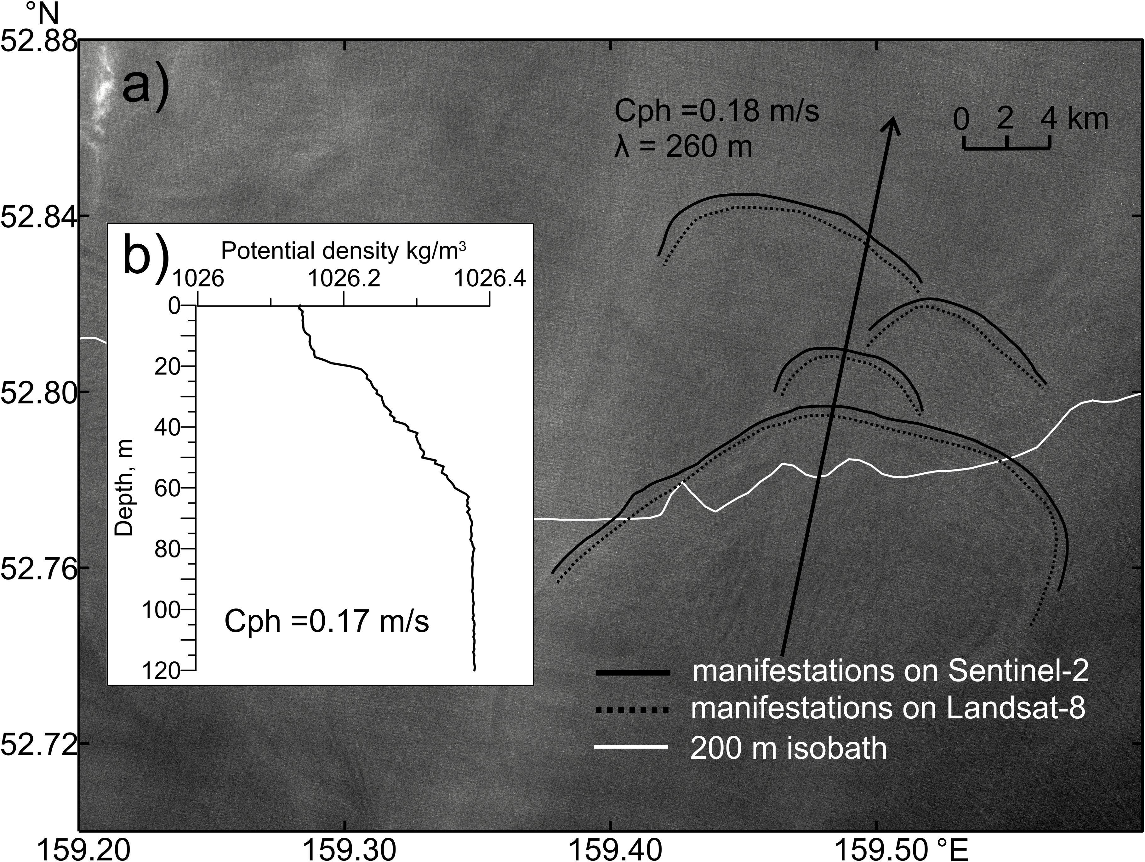 Figure 6. Analysis of NLIWs propagation characteristics based on sequential satellite images: (a) Fragment of the MSI Sentinel-2 green channel image from 25.04.2018 00:26 UTC showing the positions of leading wave crests of NLIW manifestations (solid lines – from MSI Sentinel-2 at 25.04.2018 00:26, dashed lines – from OLI/TIRS Landsat-8 at 25.04.2018 00:16). denotes the phase speed and λ the wavelength estimated from sequential satellite images; (b) Vertical distribution of potential density from in situ measurements taken on 11 April 2018 at the location 52.817°N, 159.02°E (marked with a cross). Here indicates the phase speed estimated using the two-layer approximation.