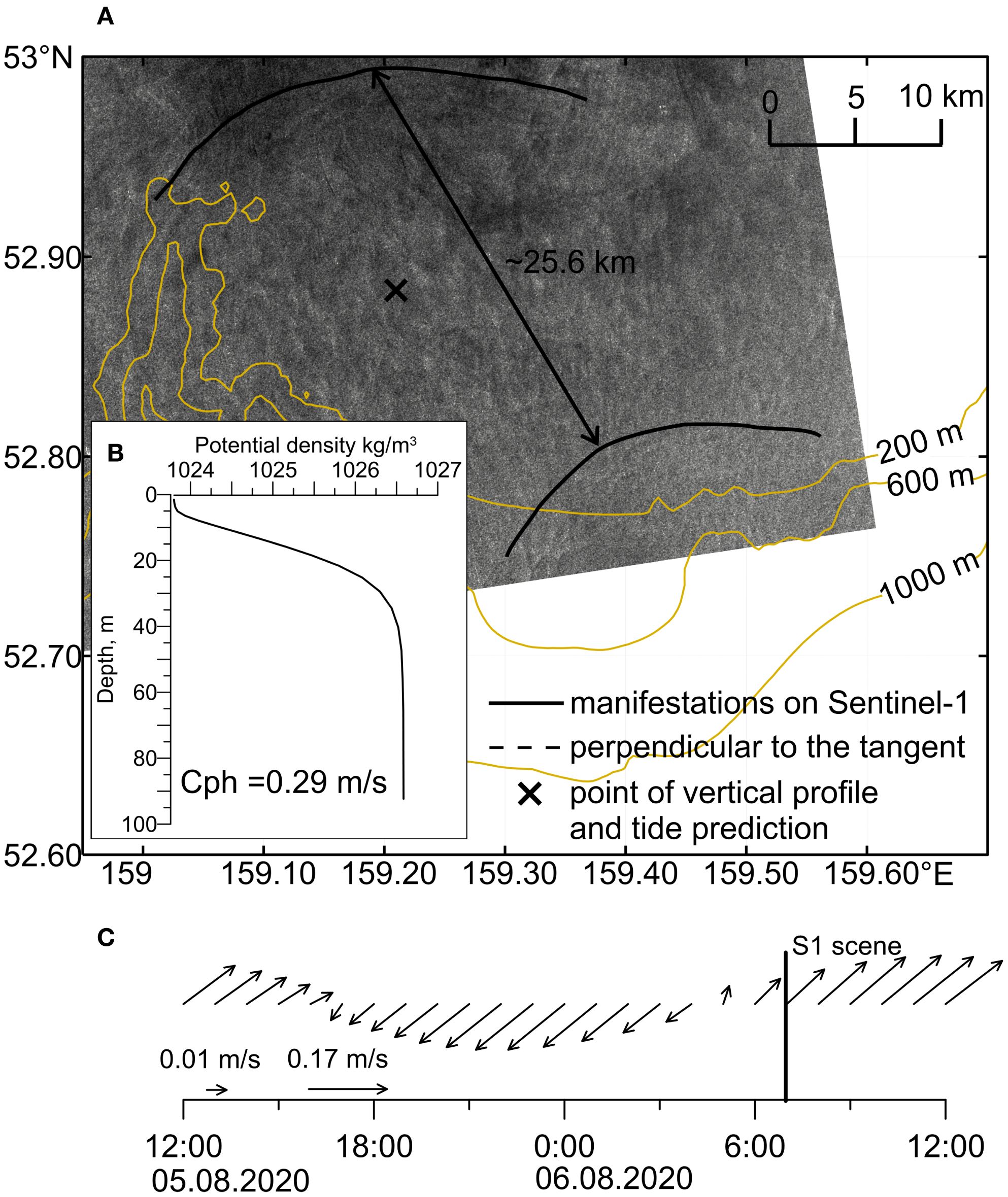 Figure 7. Consecutive manifestations of NLIW packets on a single radar image: (A) fragment of Sentinel-1 image from 06.08.2020 07:17 with marked positions of leading crests of NLIW packets; (B) vertical distribution of potential density from reanalysis data dated 06.08.2020; (C) total tidal currents from the regional FESOM-C model at the same location marked with a cross (the vertical line indicates the time of the satellite image).