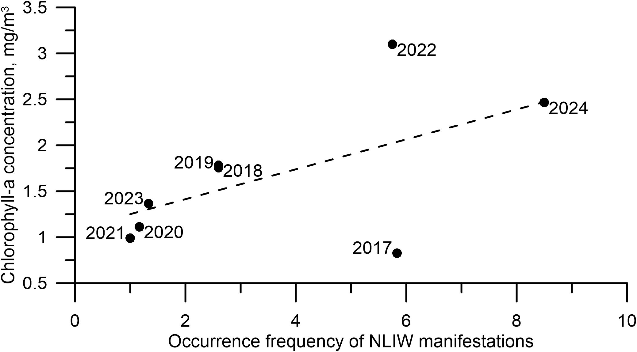 Figure 10. Variability of chlorophyll-a concentration (MODIS data) and frequency of NLIW occurrences in the “hot spot” region near Cape Shipunsky during Augusts from 2017 to 2024. The dashed line shows the linear approximation of the relationship between the described variables with R² (coefficient of determination) equal to 0.4.