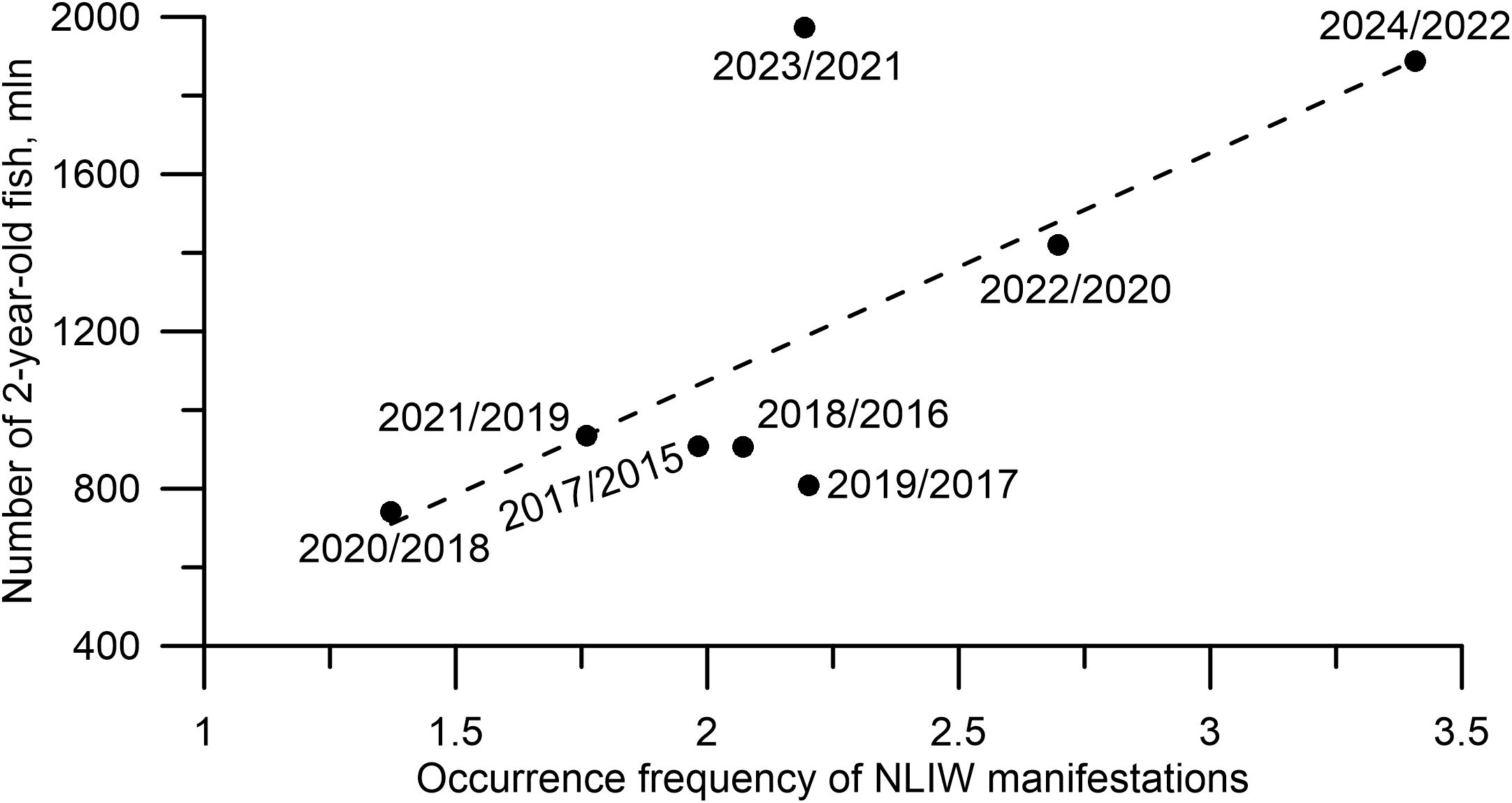 Figure 11. Interannual variability in the abundance of 2-year-old walleye pollock and the frequency of observed NLIW manifestations from May to September during 2017/2015–2024/2022. The dashed line shows the linear approximation of the relationship between the described variables with R² (coefficient of determination) equal to 0.6.