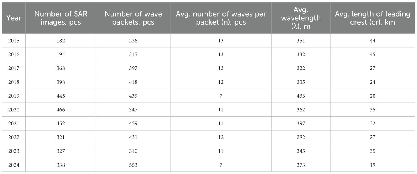 Data on the interannual variability of detected NLIW manifestations are summarized in Table 1. It should be noted that the distribution of available SAR images across years is uneven: approximately 200 images per year were processed for the study area in 2015–2016, whereas more than 450 images per year were available in 2019–2021. The data show that when the number of available images is low, there is a correlation between data volume and the number of detected wave manifestations. However, once a certain data threshold is reached (over 300 images), this dependence disappears, indicating that such data volume is sufficient for a representative assessment of wave activity for a given year. On average, in years with adequate coverage of SAR images, about 420 NLIW packet manifestations are recorded in the study area annually. The highest ratio of waves per image was observed in 2024 and the lowest in 2020. Despite pronounced interannual fluctuations, there is an overall increasing trend in the number of recorded wave manifestations over the study period.