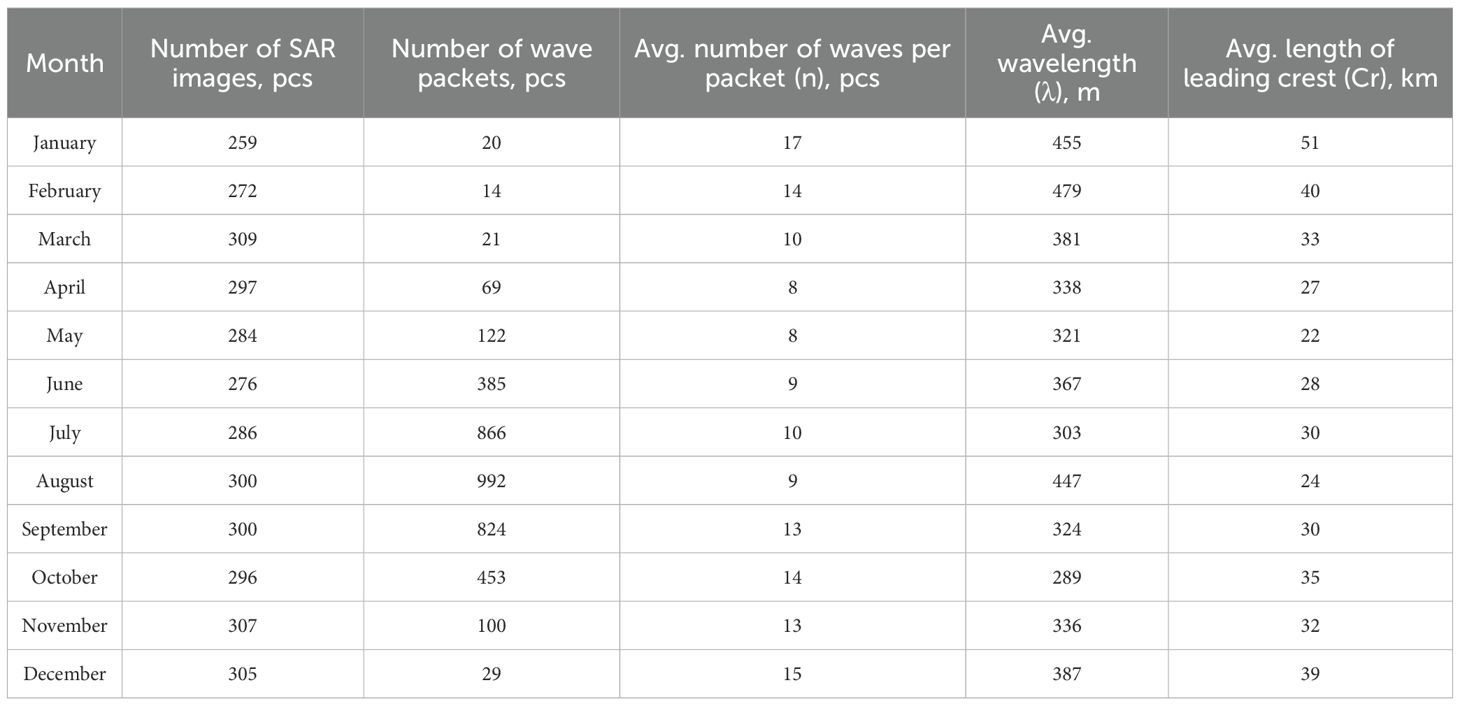Table 2 presents the intra-annual variability of NLIW occurrences by month. The distribution of SAR images throughout the year is fairly uniform; however, the number of detected waves varies substantially: the minimum values are observed in February, while the maximum (up to 70 times higher) occur in August. Overall, the lowest monthly wave counts (fewer than 21) are recorded from January to March, and the highest—in July and August (over 820). Meanwhile, other wave parameters show less pronounced fluctuations and generally follow the seasonal pattern described above.